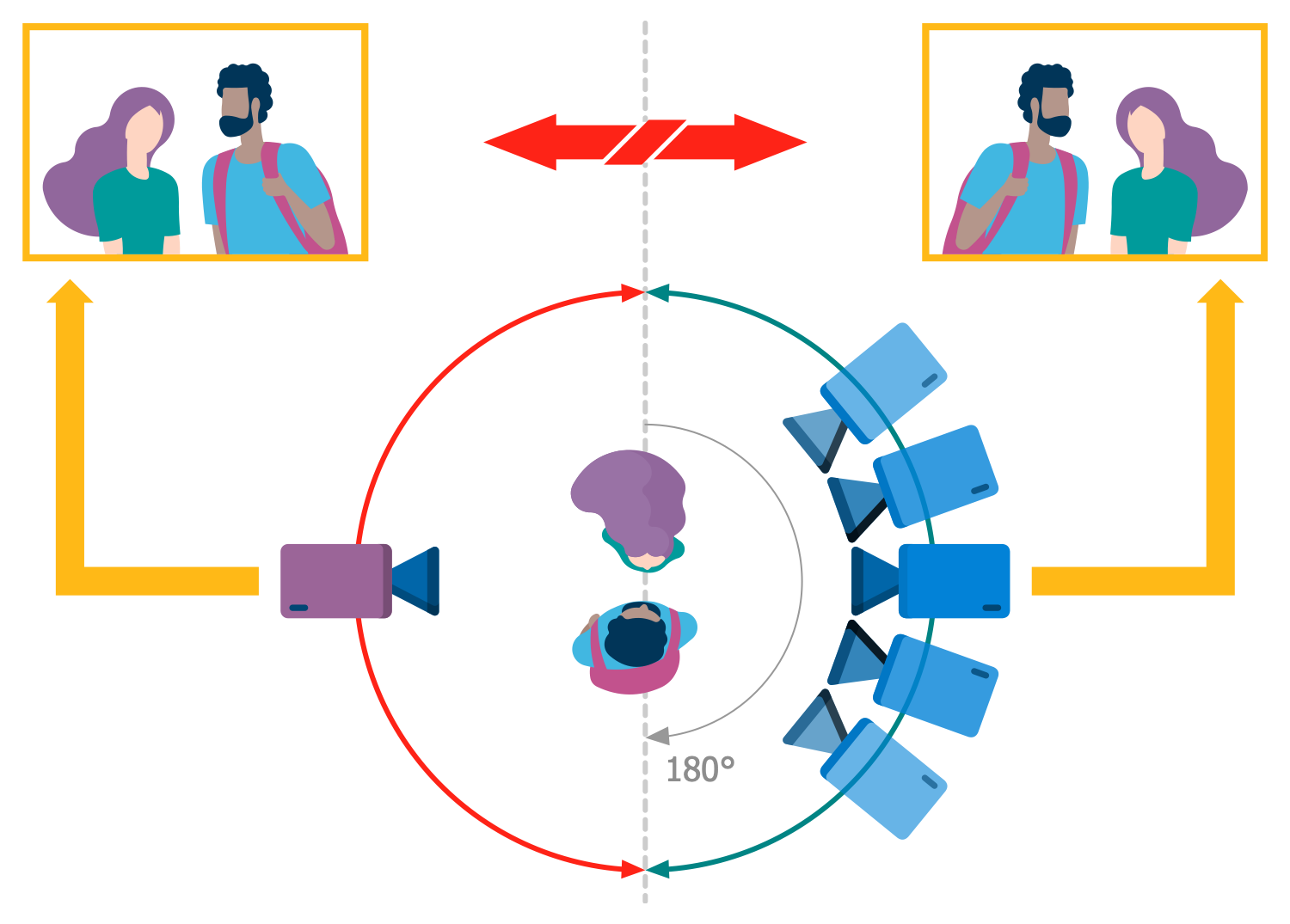 This sample illustrates the rule of 180-degree cinema, which states that the point and zoom of the shooting can change, but it is necessary to maintain the direction of the actors' view throughout the scene. The imaginary line in a scene of communication two characters is shown as the axis in a diagram. During the shooting, the camera should not cross this axis. You can also see the 180° arc and green zone in which the camera can move, the character presented as the man in this diagram will be on the left and the woman on the right. If the camera goes into the red zone, the characters will switch places on the screen. So, if a camera stays on one side of the imaginary line, the spatial relationship between two characters will be consistent from shot to shot during all scene while it doesn't change its position on the opposite side. A sudden change in position is undesirable because it can disorient the audience, but is rarely used to obtain a special effect.