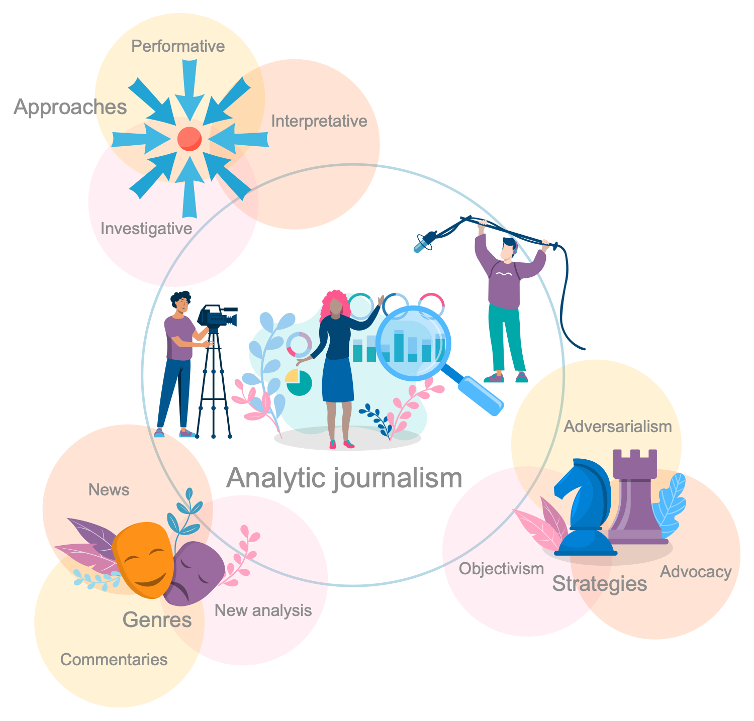 This sample is dedicated to the versatility of analytical journalism, which is a unique independent field of journalism, including comprehension of complex reality, analysis and explanation of phenomena, collecting disparate data and establishing relationships between them, presenting forecasts in some problematic spectrum, not the information about current events in the country. At the same time, the analytic journalism uses the approaches of investigative journalism and explanatory reporting, as well as the methods of multiple non-journalistic disciplines, social science researches, and others. It is aimed at the deep understanding and explaining the issues and phenomenon. Analytical journalism includes various journalistic approaches (performative, interpretative, investigative), strategies (objectivism, adversarialism, advocacy), and genres (news, commentaries, new analysis). All they are specified in this diagram. Design professional-looking infographics with Mass Media Infographics solution drawing tools and successfully post them in social media sites.