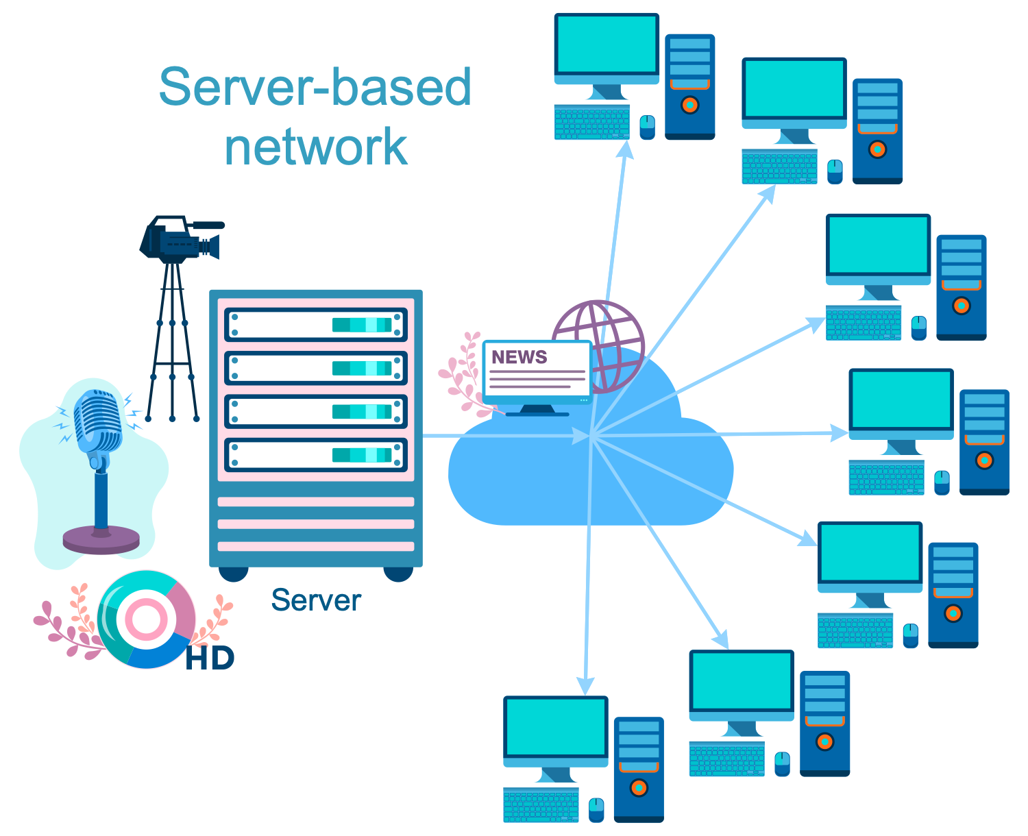 This sample shows the IPTV (Internet Protocol television) network schematic. IPTV is the standard for the safe and reliable delivery of a variety of television content using Internet Protocol (IP) networks. This is a technology that is gradually replacing traditional television broadcasting via terrestrial, satellite and cable formats and is developing at a high speed. IPTV enables continuous streaming and virtually instant content playback. That's why it was taken the name of the streaming media. IPTV network is a server-based network, which provides Internet television to numerous users simultaneously and gives great advantages and convenience to the subscribers because of the ability to watch all they like whenever and wherever. IPTV technology is also deployed in subscriber-based telecommunications networks through the use of set-top boxes or other equipment, for delivering media and related services to corporate and private networks.