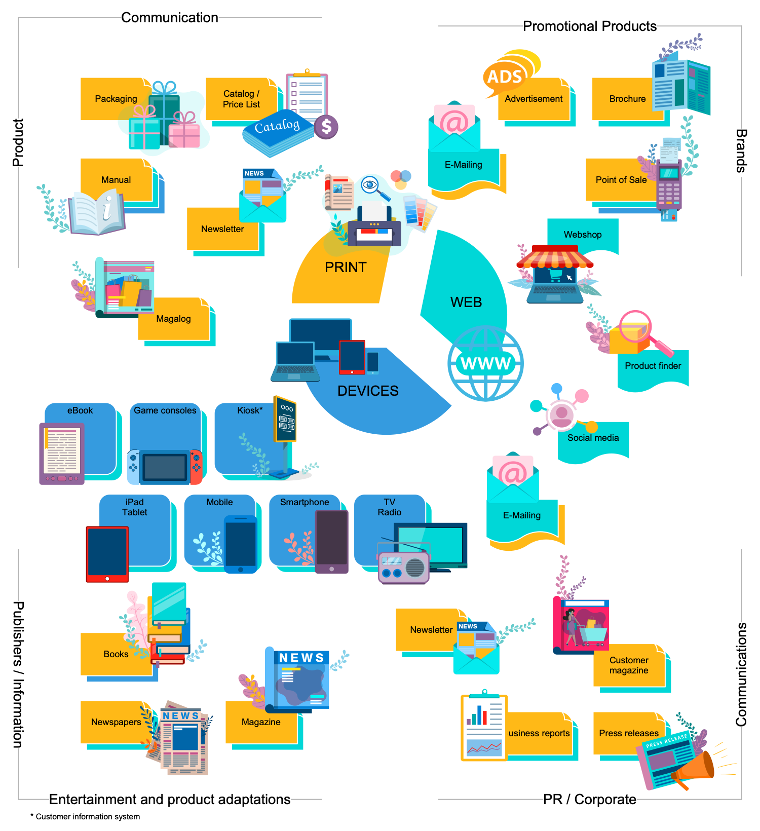This sample provides an overview of the areas of multi channel publishing that are used by both small and large publishers. Multi channel publication means the simultaneous distribution of content in different ways: in print materials, internet resources, social media, websites, mobile applications, etc. The readers can choose themselves the source they prefer to read your content - in printed or digital form using electronic gadgets or other devices. Four large areas of the multi-channel publishing are presented in this diagram: Product Communication, Promotional Products / Brands, Publishers / Information / Entertainment and product adaptations, PR / Corporate Communications. The choice of a channel belongs to the publisher and depends on the goals he pursues and the target audience. But since people have completely different preferences when searching for information, using one channel significantly limits your possibilities. In turn, using a variety of channels allows you to get a wider customer base.