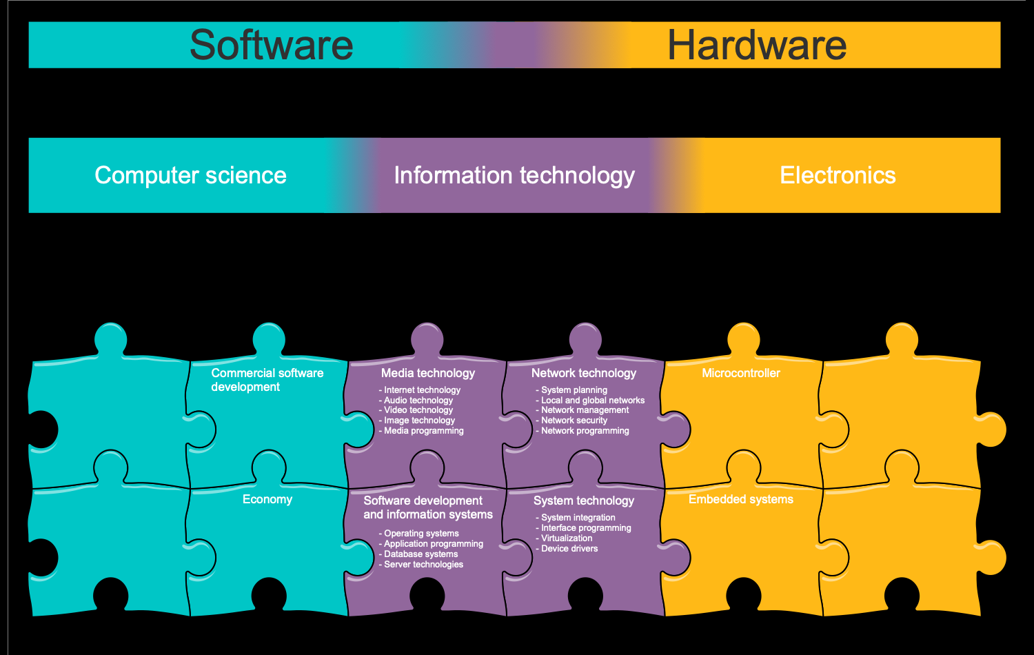 This diagram is designed in an unusual puzzle form and is intended in getting an education in the field of information technology (IT). The IT training is like a bridge between computer science and electronics, software and hardware, which are presented at the opposite sides of this puzzle. Information technology is presented in the middle. The main areas in the IT department are media technologies, network technologies, system technologies, software development and information systems. The corresponding sub-items for each group are also listed in the diagram. Computer science includes commercial software development and economy. Electronics is presented by microcontroller and embedded systems. All three parts of this diagram are colored differently to achieve a vivid visual effect and highlight the segmentation of the parts. Use the ready-made puzzle stencil from the solution's "Mass media" library to construct an attractive diagram in just a few seconds.