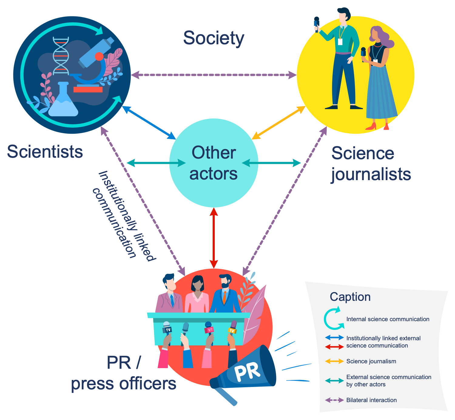 This sample gives an overview of the science field and communication of actors within it. Scientific communication is a really important practice for informing, training, sharing and exchanging information, interesting facts, wonders and scientific observations, as well as to raise awareness on topics related to science, your personal and other people. The main actors of this process are scientists, science journalists, and PR / press officers. Science communication supports and informs about scientific researches and discoveries, as well as explains the latest methods, and contributes decision making and eliminates scientific misinformation. For effective science communication are used different methods and techniques. The interactions and links between significant actors in this field are designated in a diagram with two-directional links of varied colors. Thus, the communication of scientists with society is carried out through communication with journalists. Institutionally related relationships are established between scientists and PR specialists.