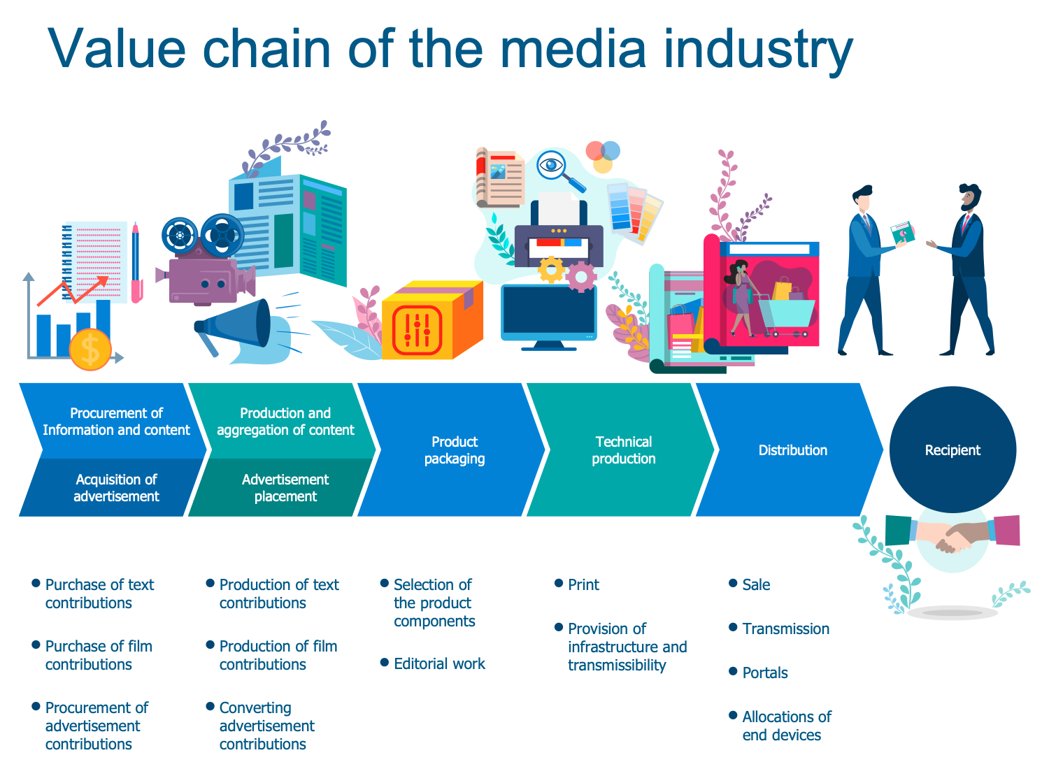 This sample shows the value chain of the media industry, which extends Michael Porter’s concept, describes the basic principles of the media industry and how to create it until the information and content are delivered to the recipients. In order to understand the specifics of this industry, the most important stages within it were identified and presented in a visual form. Now, it is possible to analyze each stage of the activity more closely, to understand its economic specifics more clearly, and to find ways to optimize each stage of this process. Being a tool of strategic analysis, this value chain allows you to study and analyze the activities for the purpose of strategic planning in the media industry, as well as really effectively identify the sources of competitive advantage. The first step is the procurement of information and content and acquisition of advertisement. The second step is the production and aggregation of content and advertising. Then follow the product packaging, technical production, and distribution.