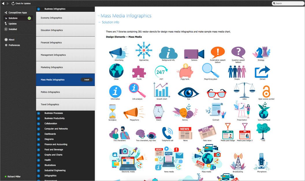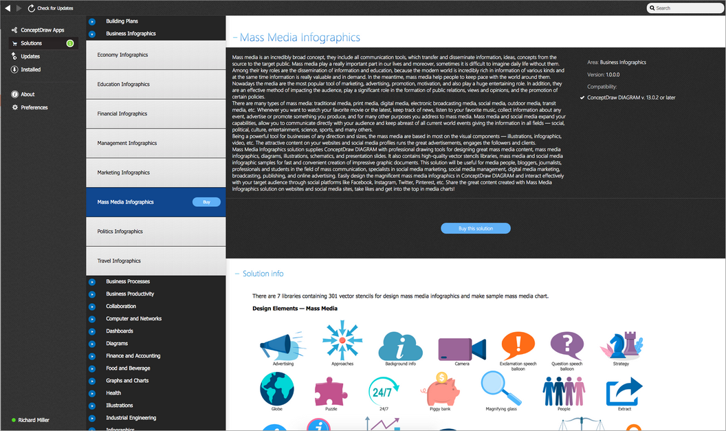 After ConceptDraw DIAGRAM is installed, the Mass Media Infographics solution can be purchased either from the Business Infographics area of ConceptDraw STORE itself or from our online store. Thus, you will be able to use the Mass Media Infographics solution straight after.