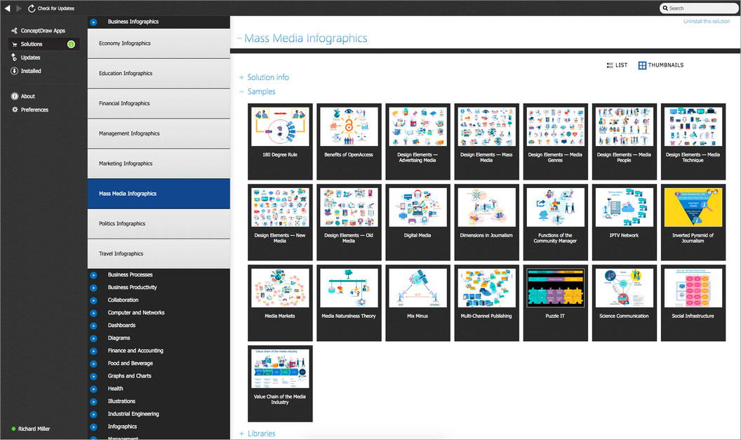 First of all, make sure that both ConceptDraw STORE and ConceptDraw DIAGRAM applications are downloaded and installed on your computer. Next, install the Mass Media Infographics solution from the ConceptDraw STORE to use it in the ConceptDraw DIAGRAM application.