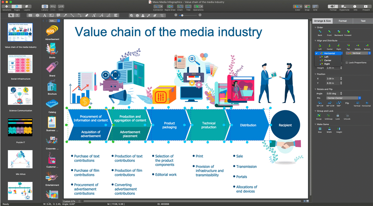 There are 15 examples and 7 libraries containing 301 vector stencils for design mass media infographics and make sample mass media chart.