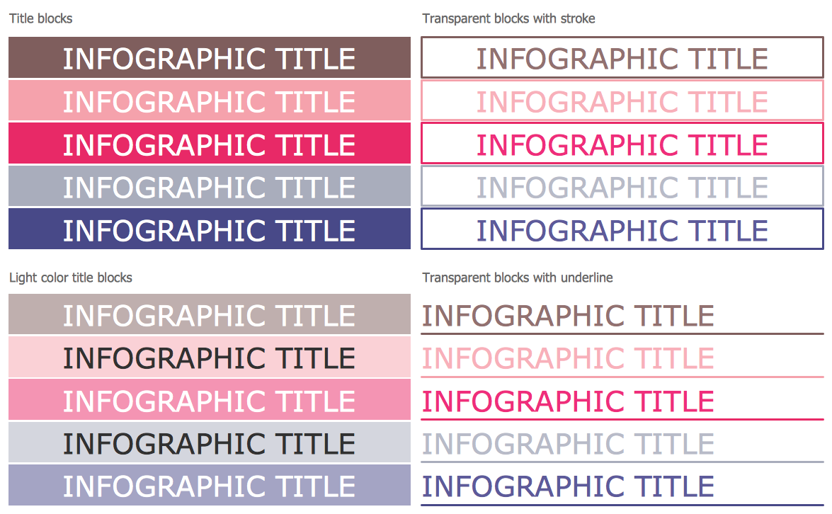 The Typography Infographics solution can be used while working in the ConceptDraw DIAGRAM diagramming and drawing software allowing its users to create different textual infographics. It includes infographic samples, templates as well as stencil libraries full of typographic design elements which allow adding the already pre-made typographic elements in all the ConceptDraw DIAGRAM users’ infographic documents.
