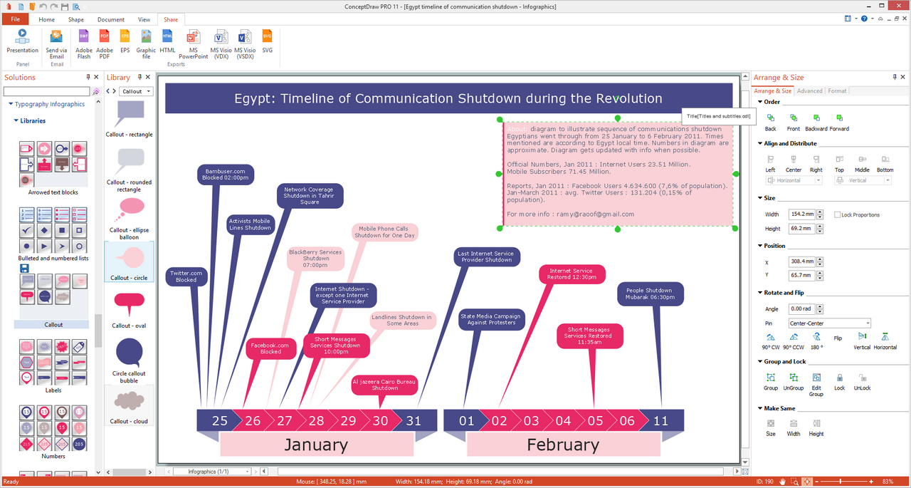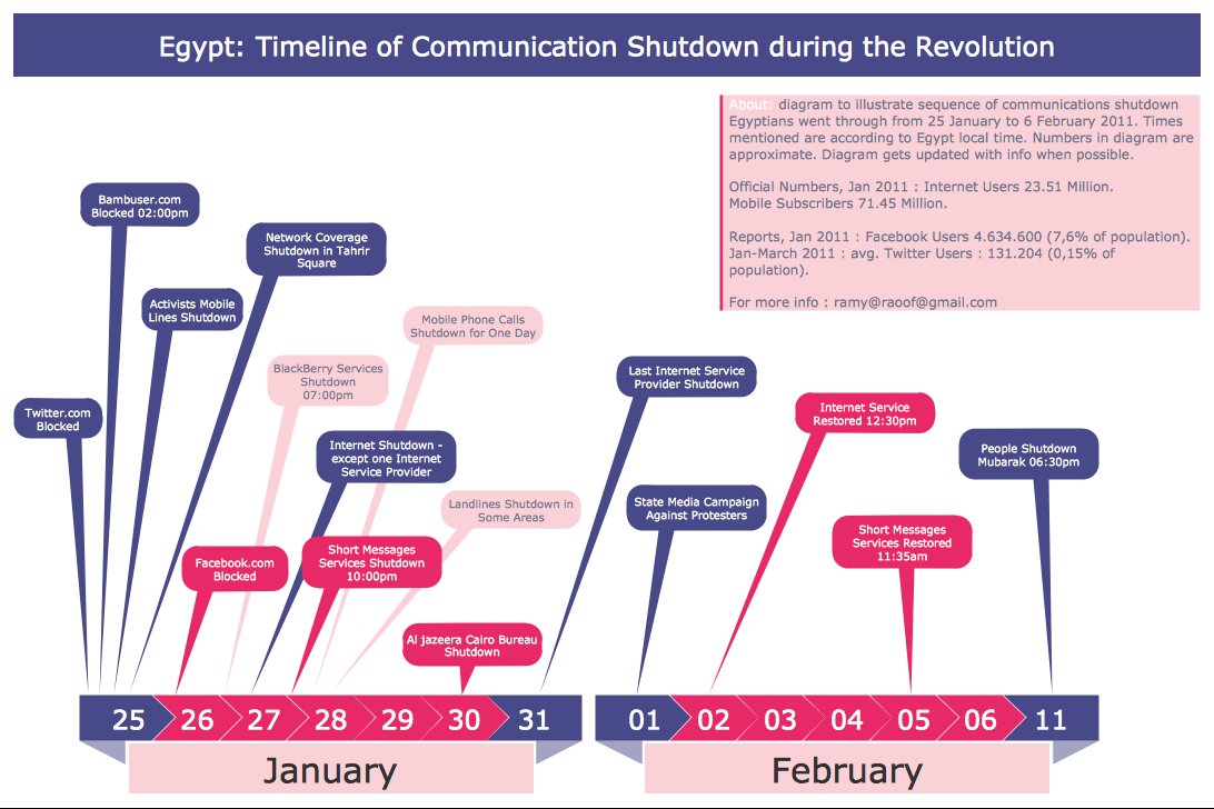 This example shows the Timeline of Communication Shutdown in Egypt. Using callouts is a convenient way to arrange large quantities of useful data in the typography graphic. Apply different colors and various of typography fonts to highlight the most important information.