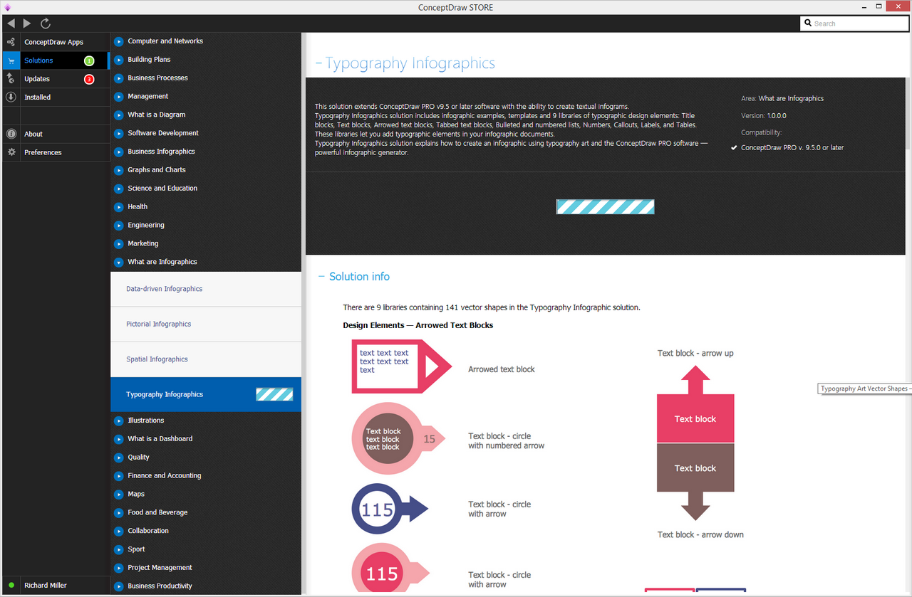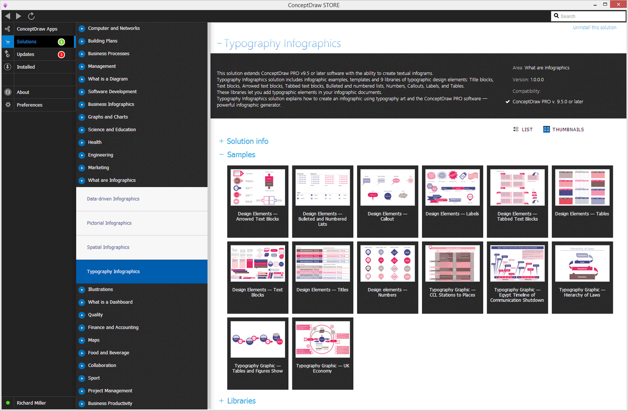 After ConceptDraw STORE and ConceptDraw DIAGRAM are downloaded and installed, you can install the Typography Infographics solution from the ConceptDraw STORE.