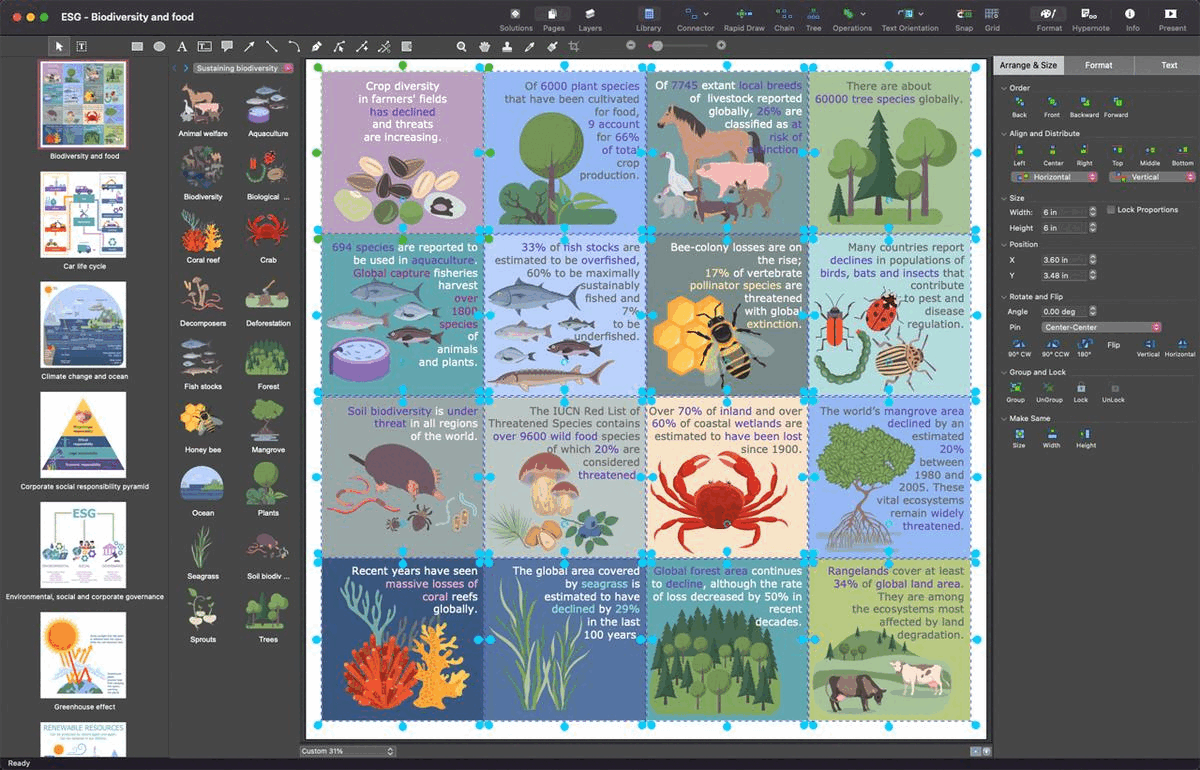 Using the Environmental Social and Corporate Governance solution, by adding design elements taken from template libraries, and editing pre-made examples, you will get a description of the policies of companies that adhere to ESG standards to help investors assess risks and make profitable investments.
