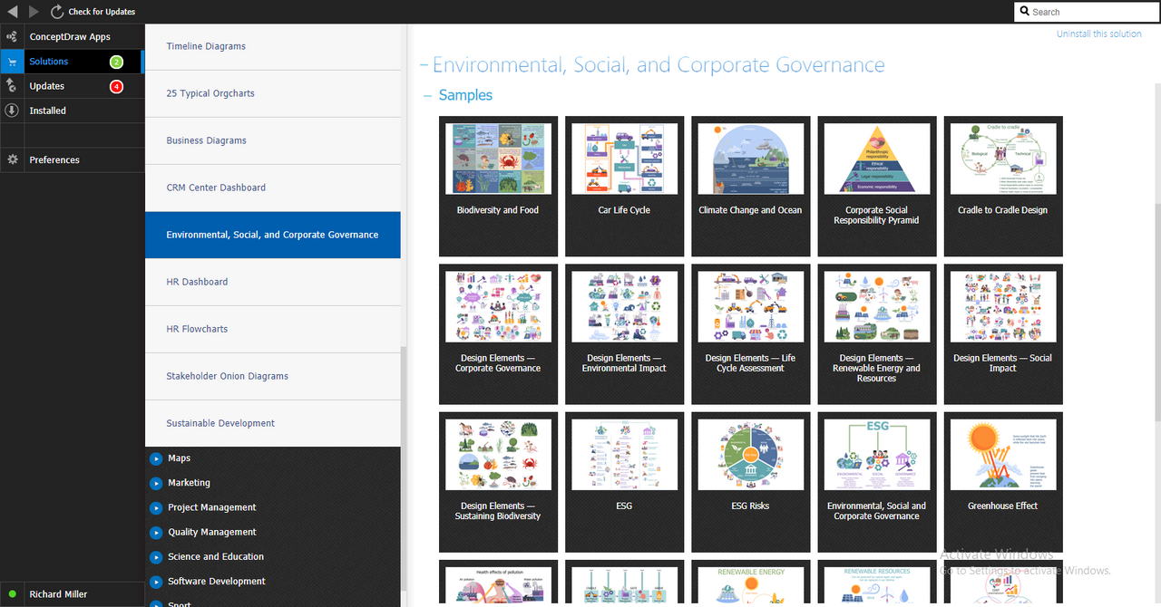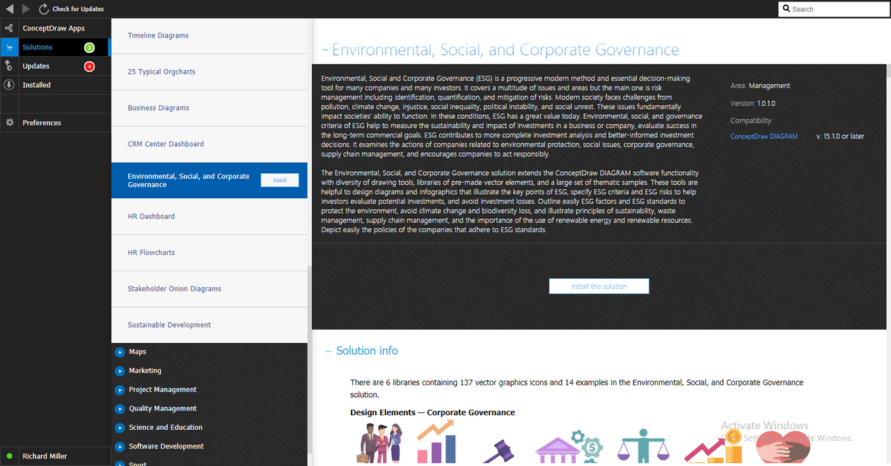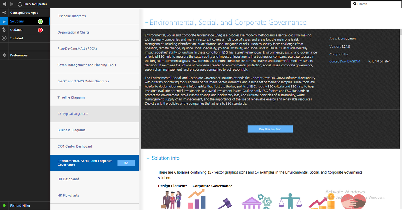 After ConceptDraw DIAGRAM is installed, the Environmental, Social, and Corporate Governance solution can be purchased either from the Management area of ConceptDraw STORE itself or from our online store. Thus, you will be able to use the Environmental, Social, and Corporate Governance solution straight after.