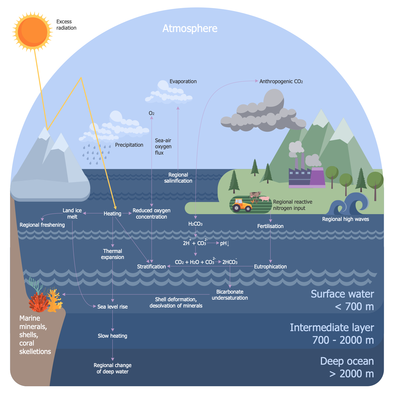 This infographic sample shows an overview of climatic changes and their effects on the ocean. Ocean warming is one of the global issues nowadays. This sample helps investigate the cause and effects of ocean surface warming. The root cause is an excess of solar radiation entering the atmosphere. Being reflected by ice, this radiation is taken up by the surface of the ocean and causes its warming. Further heating leads to heating of the intermediate layer of water, melting of continental ice, which causes local desalination, thermal expansion and an increase in the ocean level. The heating of vast areas of the ocean surface causes enormous evaporation and salinization of the water. Decreased solubility of gases and reduced oxygen concentration in the ocean are also the result of ocean surface warming, which is detrimental to the entire marine ecosystem. In addition, an excess of anthropogenic carbon dioxide causes ocean acidification and a shortage of hydrocarbons. As a result, shells and other minerals dissolve, and the amount of marine phytoplankton is reduced.
