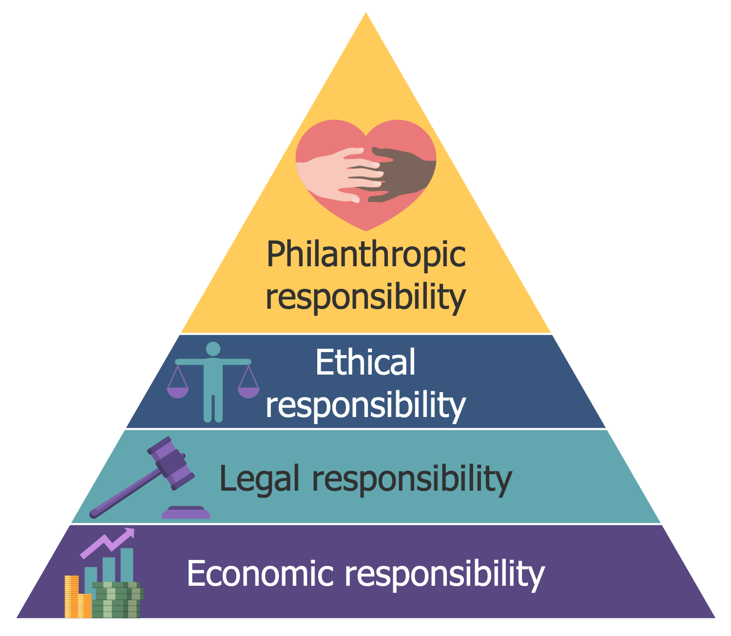 This sample is dedicated to corporate social responsibility (CSR). It is international private business self-regulation including internal responsibility and regulation at all levels including regional, national, and international. The offered pyramid describes corporate social responsibility as a combination of several responsibilities. It includes four levels: economic responsibility, legal responsibility, ethical responsibility, and philanthropic responsibility. CSR is a part of the strategic business development of a company. The coordination of CSR methods with a company's business model and their integration into it leads to success. In addition, CSR supports the brand's development and contribution to its reputation, social goals, and volunteering. It encourages companies in making a positive impact on the environment, reducing waste and pollution, participating in educational and social programs, and satisfying the interests and needs of all stakeholders including consumers, employees, investors, etc. Because the relations with the public have a positive impact on the business development and contribute to the enhancement of the company's profits.