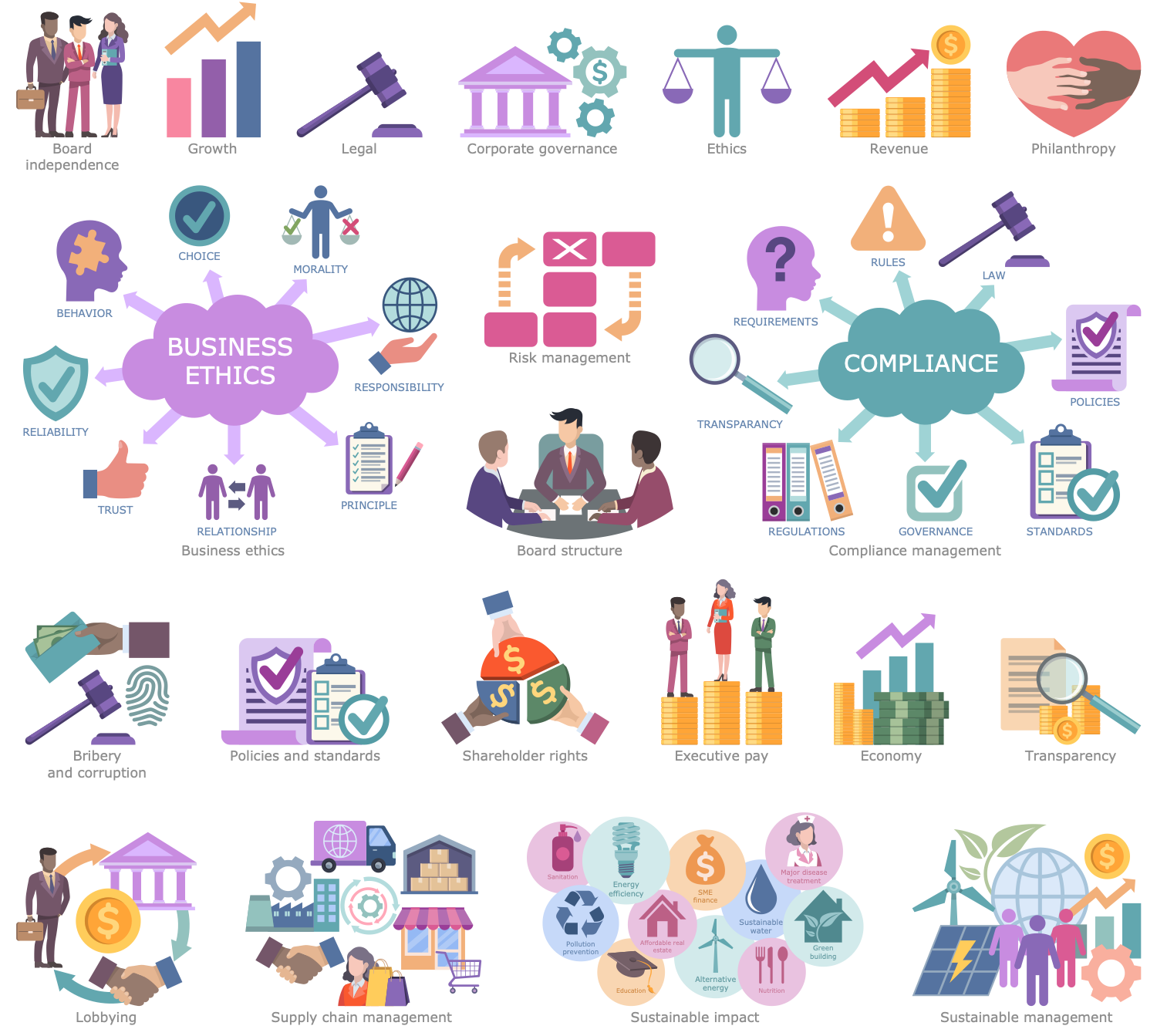 There are a few samples that you see on this page which were created in the ConceptDraw DIAGRAM application by using the Environmental, Social, and Corporate Governance solution. Some of the solution's capabilities as well as the professional results which you can achieve are all demonstrated here on this page.