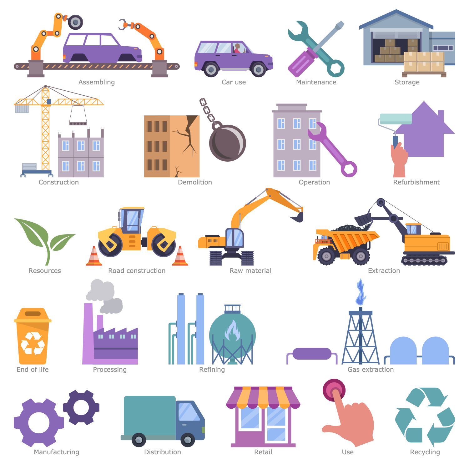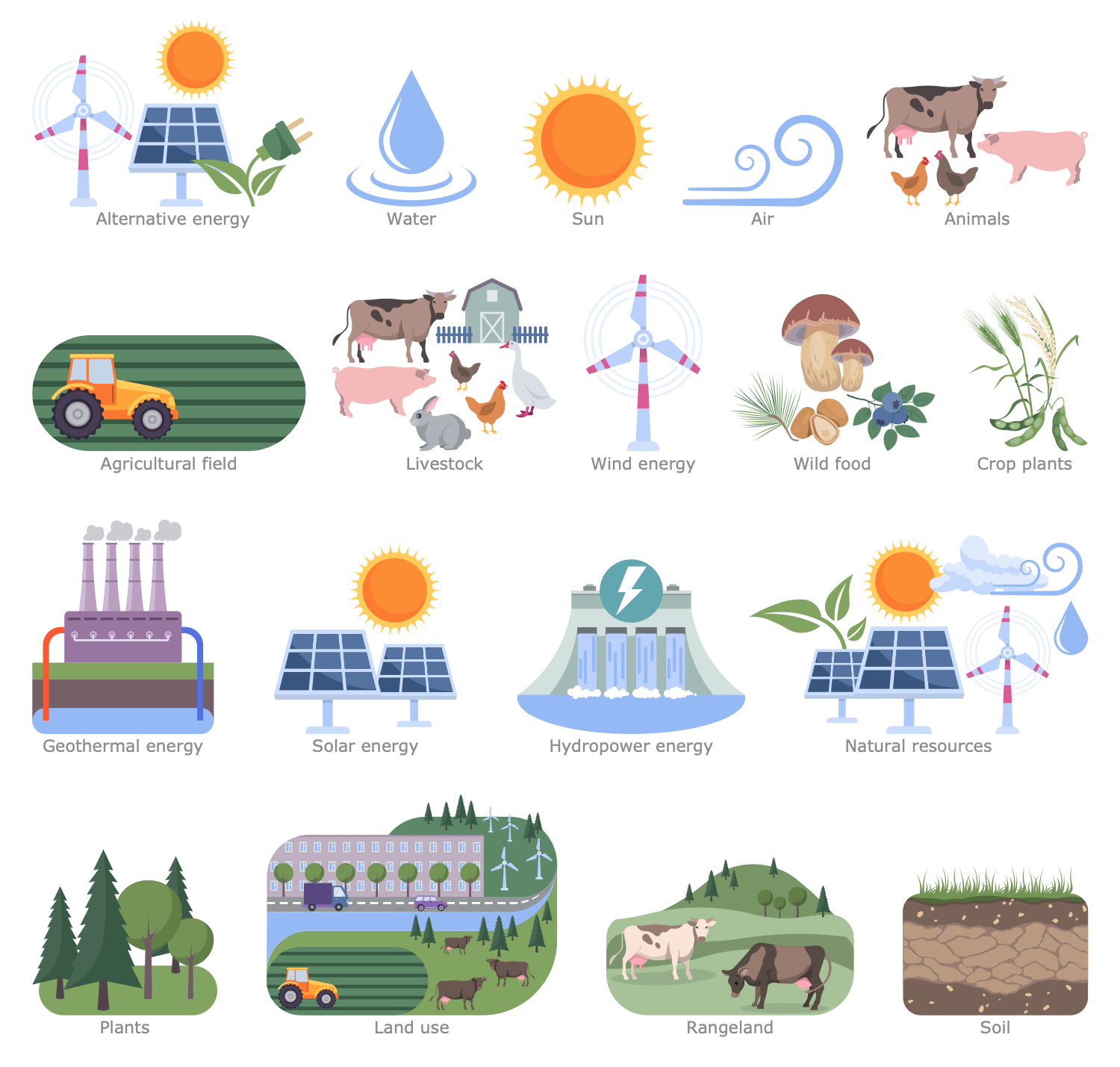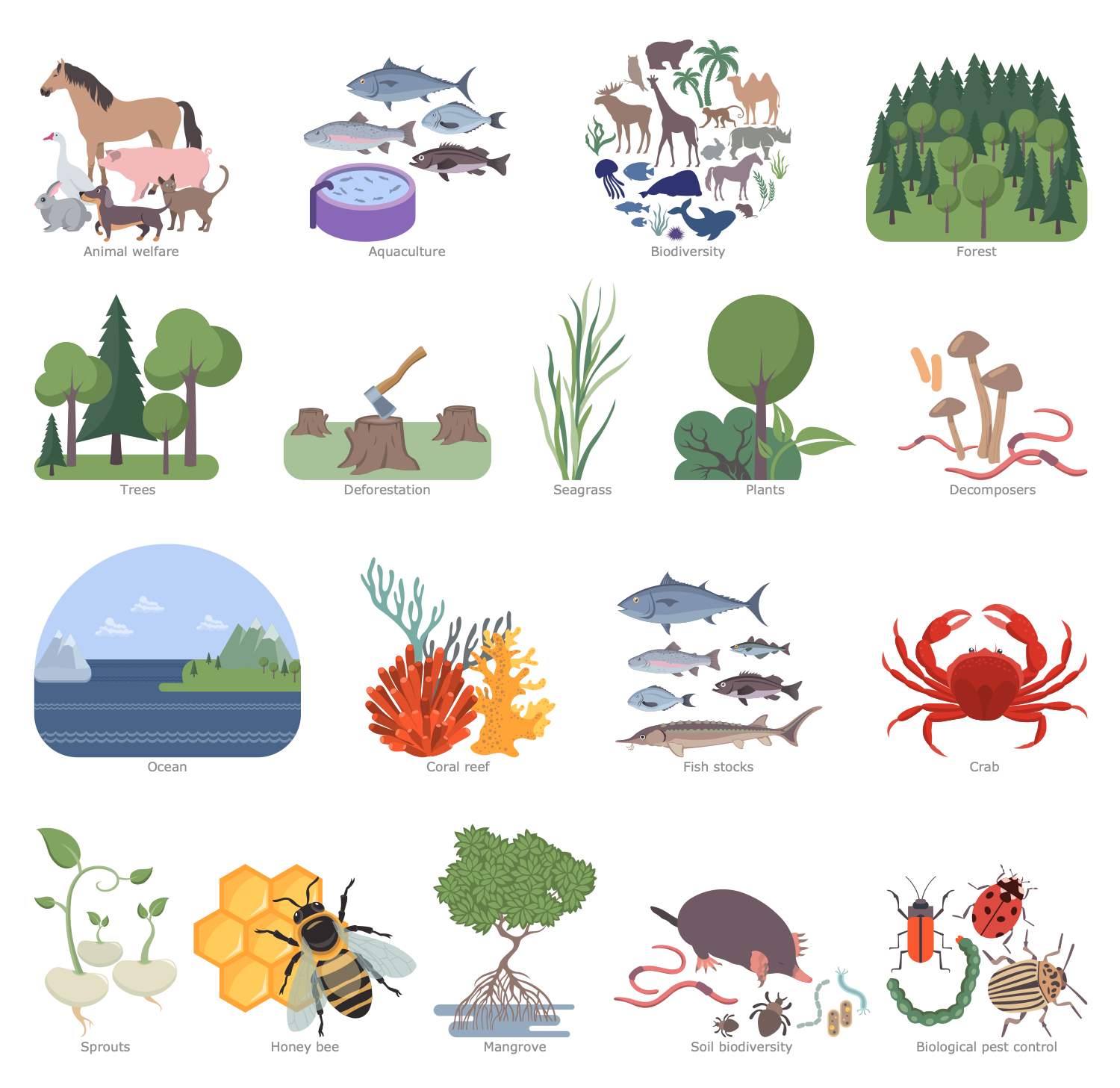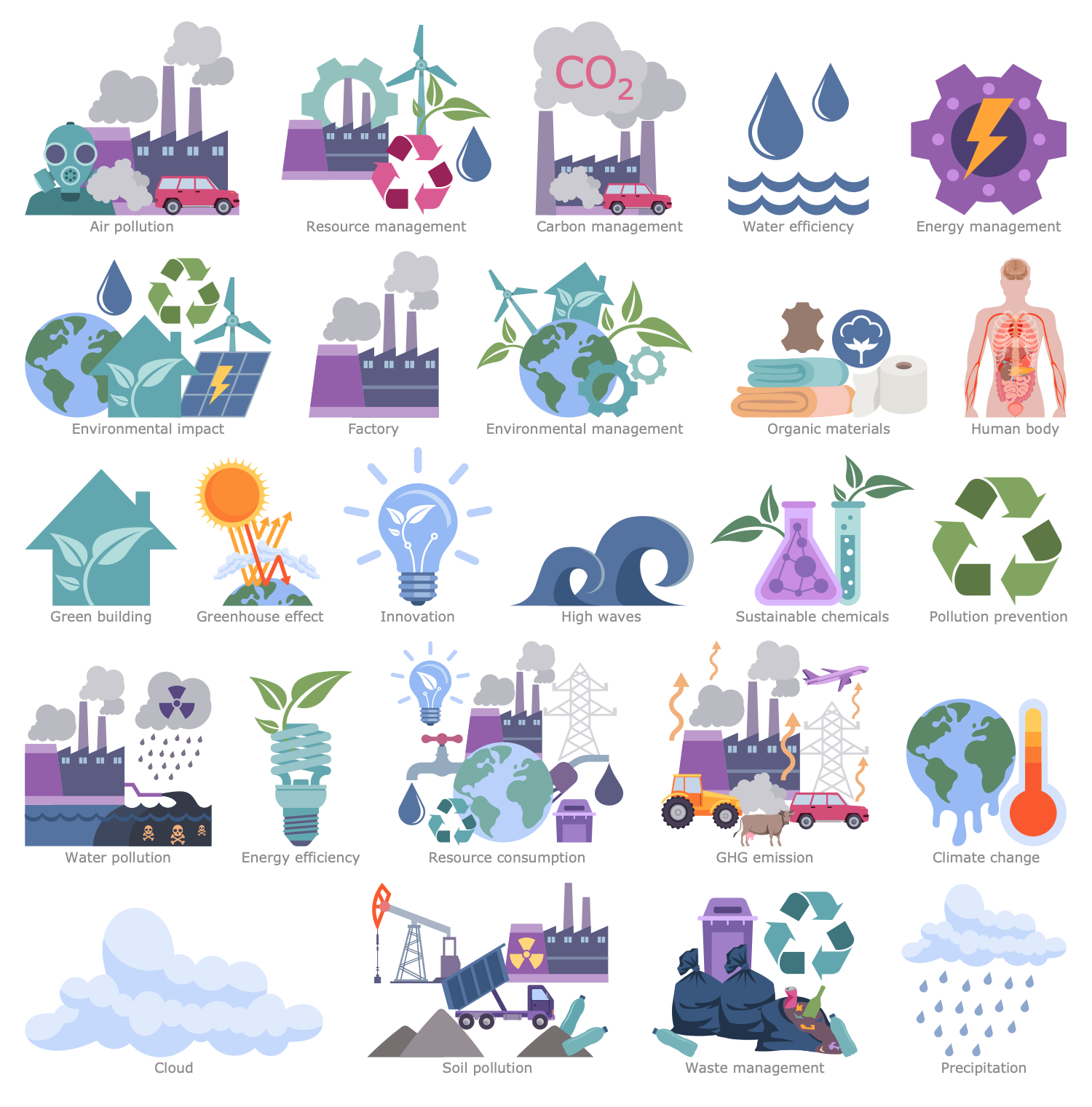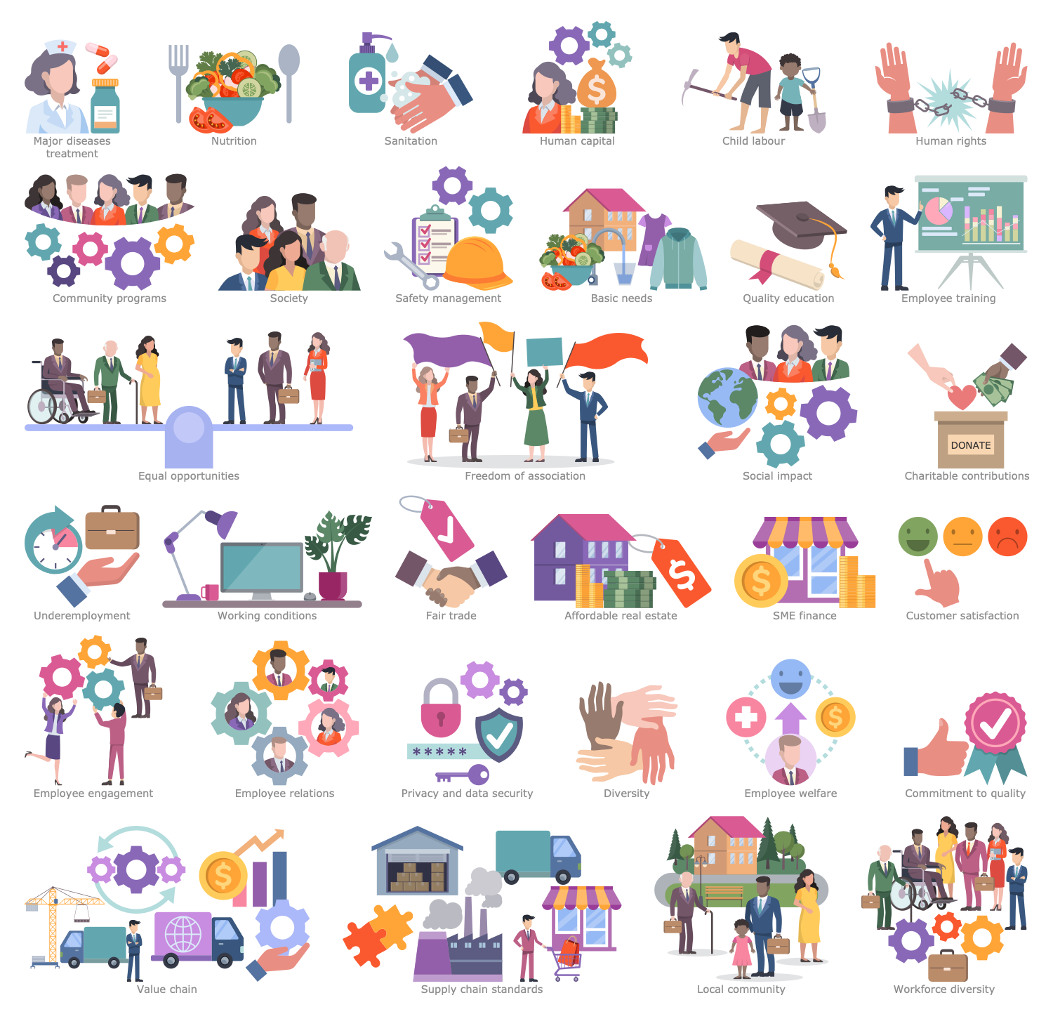 The Environmental, Social and Corporate Governance solution has 6 libraries containing 137 vector graphics icons and 14 examples. Created to help anyone who needs to present information in a compelling visual form that instantly conveys the meaning of ESG-related activities in the field of economy, environment and society.