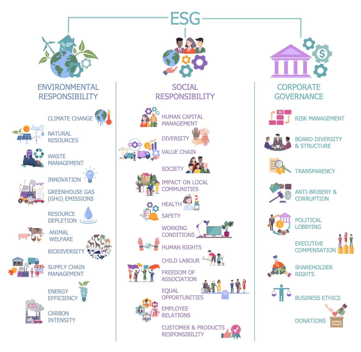 This diagram was created in ConceptDraw DIAGRAM using a combination of libraries from the Environmental, Social, and Corporate Governance Solution. An experienced user spent 10 minutes creating this sample.