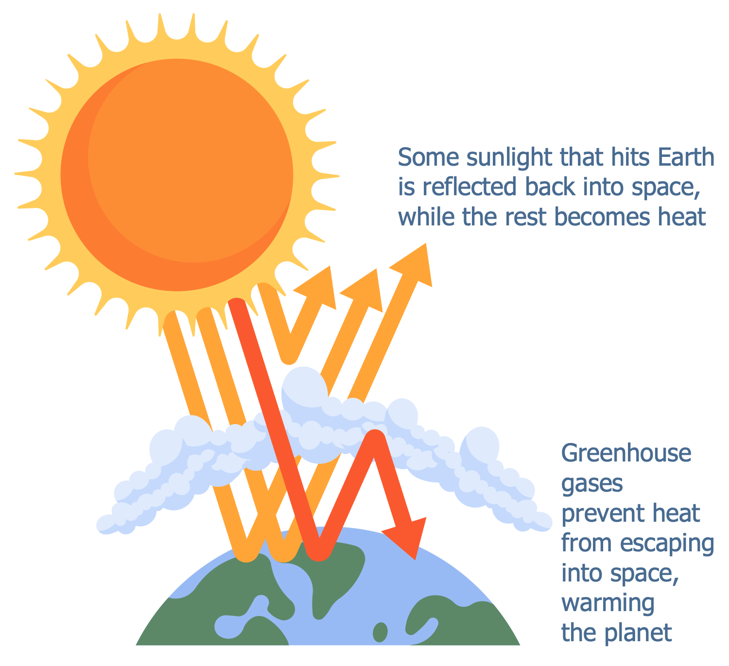 This infographic sample illustrates the greenhouse effect. The Earth's atmosphere is transparent for the sunlight that passes through it and heats the planet's surface, and only some sunlight is reflected back into space. Greenhouse gases are capable to catch solar radiation energy within a planet's atmosphere. They include gases with three or more atoms and most diatomic gases with two different atoms. Water vapor, carbon dioxide (CO2), methane (CH4), tropospheric ozone are the most common examples of greenhouse gases. They differ in effect, residence time in the atmosphere, and altitude. In addition, greenhouse gases are divided into two groups: direct and indirect. Direct greenhouse gases can directly absorb solar energy in certain wavelength ranges, indirect greenhouse gases produce other greenhouse gases but do not absorb solar energy themselves. The warmed Earth's surface radiates heat taken from sunlight; greenhouse gases absorb it and prevent from escaping into space. As the result, the planet's warming occurs. Besides, greenhouse gases absorb and emit infrared radiation. They heat and pass heat to the surrounding air. When hitting the surface, radiant heat increases its temperature. The natural greenhouse effect is a process that allows our planet to keep warm and not freeze. But excessive greenhouse effect and increasing anthropogenic warming of the Earth is a problem at the moment.