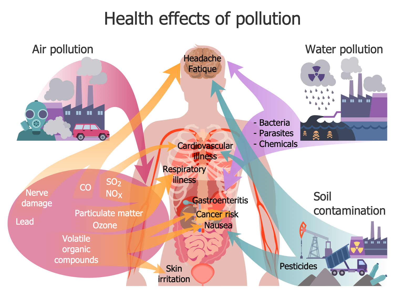 This infographic sample includes an overview of the main effects of environmental pollution on human health. The presence of harmful substances in the atmosphere, water and soil damages the environment, changes the climate, destroys the ozone layer, degrades the environment, harms the health of people and other living beings. The air pollution substances include methane, nitrous oxides, carbon dioxide, carbon monoxide, sulfur dioxide, particulates, and other substances. Water pollution is caused by both chemicals and biological microorganisms — bacteria and parasites. Soil contamination is mainly a result of human activities such as industrial activities, agricultural activities, sewage discharges, urban runoff, and improper disposal of waste. It is caused by pesticides, heavy metals, petroleum hydrocarbons, etc. All kinds of pollution caused by both human activities and natural phenomena are harmful factors for human health and can cause diseases of the respiratory, nervous, and cardiovascular systems, gastrointestinal tract, and other systems. They can cause allergies, skin irritations, nausea, gastroenteritis, cancer, and even death to humans and other living organisms. The health risks are related to both indirect and direct contact with the contaminated soil, vapor from the contaminants, drinking polluted water, and also bathing, washing, irrigation with it, human consumption of foods with toxic metals grown on the polluted soil, etc.