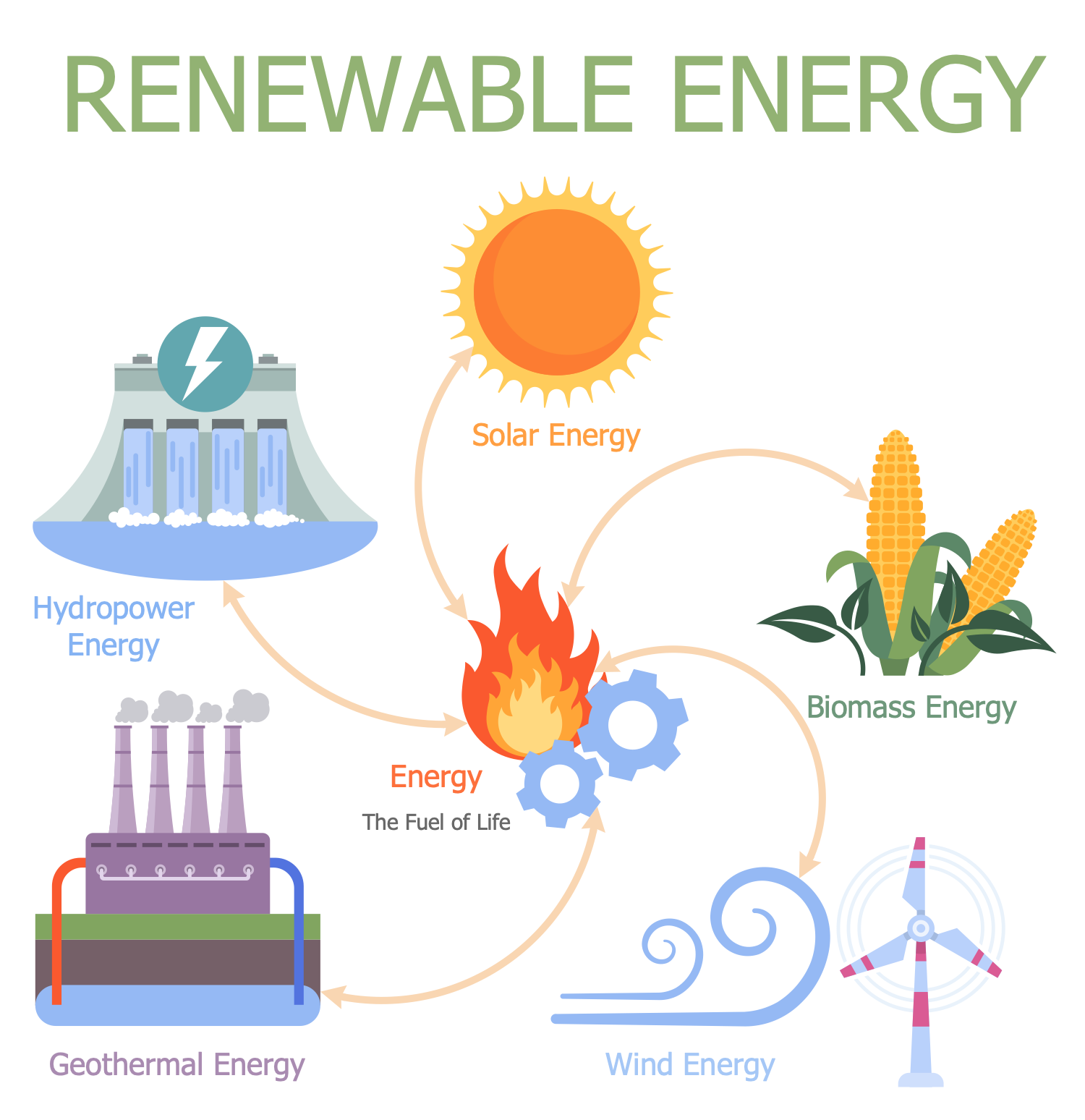 Energy is a fuel of life and a necessity in the modern world. Today, two types of energy are used — renewable and non-renewable. Renewable energy is a more preferable type of energy because it is accumulated from renewable resources that are naturally replenished. In addition, renewable energy resources exist over vast geographic areas, in contrast to non-renewable energy sources that are concentrated in limited areas. The vast majority of newly installed energy generation systems around the world are renewable. This sample ESG infographic shows the most common forms of renewable energy: solar, hydro, geothermal, wind, and biomass. Renewable energy is often used to generate electricity for the grid, to power off-grid systems, to heat or cool air and water. Most renewable energy sources are sustainable. With rapid technological developments, renewable energy systems are becoming more efficient and cheaper, and their popularity is growing. Renewable energy sources currently account for about 20% of global energy consumption and this amount will increase. Research even shows that a global transition to 100% renewable energy across all sectors is also possible and cost-effective.
