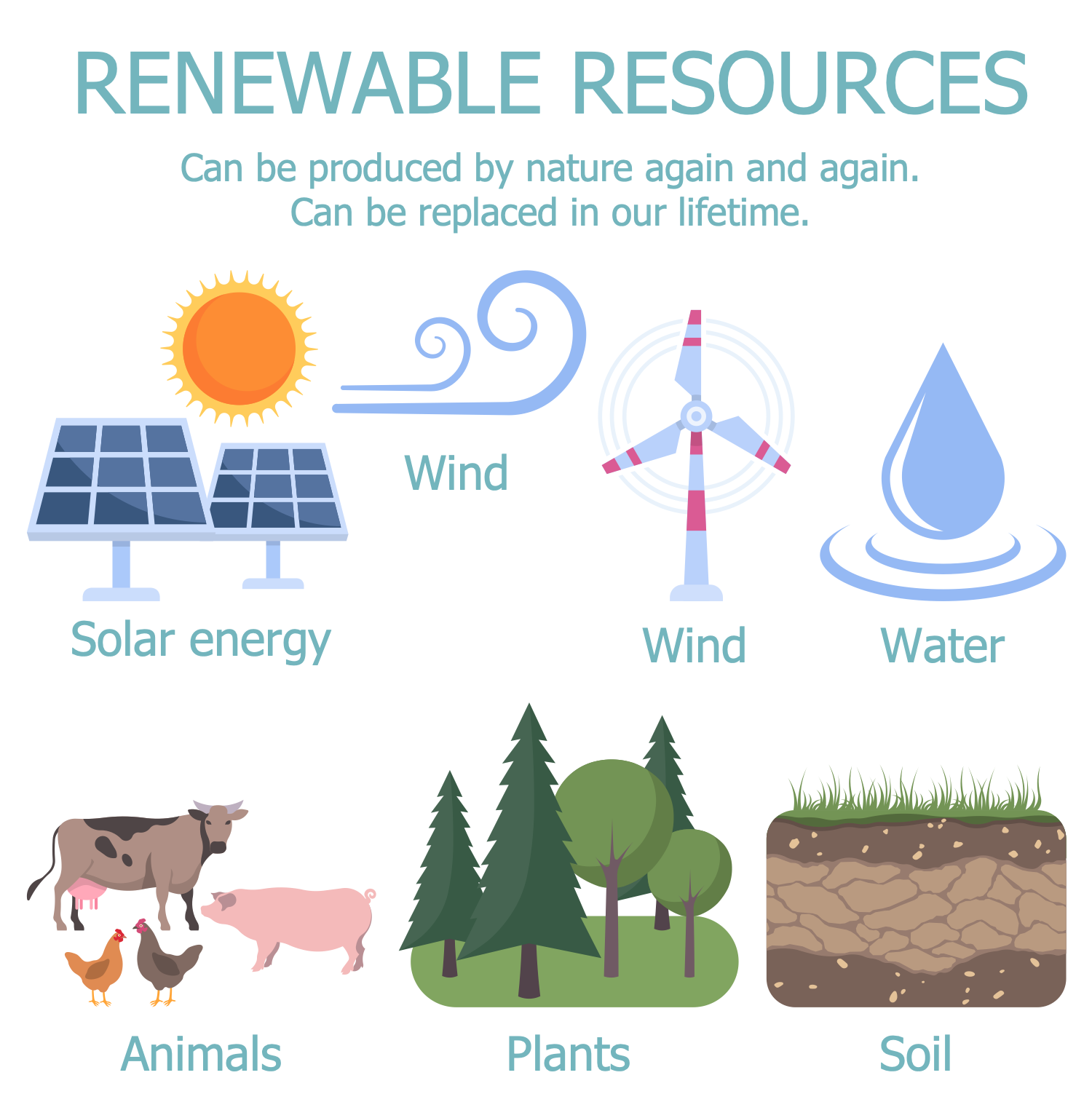 This ESG infographic sample shows renewable natural resources. These resources are restored, reproduced again and again, and replaced in a short and finite amount of time. Renewable energy resources are a part of Earth's natural environment and the largest components of Earth's ecosphere. Sunlight, wind, rain, tides, waves, and geothermal heat are examples of renewable energy sources. They exist over wide geographical areas and are replenished after their depletion by usage and consumption. The use of renewable energy sources has many advantages, in addition to being inexhaustible, reliable and sustainable, reduce global warming, improve public health and provide stable energy prices. Many countries are looking to increase their share of the renewable energy market; some of them even offer special discounts for consumers. Meanwhile, the use of renewable resources also requires careful management so as not to exceed nature's ability to replenish them. Because in an environment of growing demand, unregulated industrial development and overuse of resources can have unexpected negative results. Scientific research and life cycle assessments help assess the sustainability of various natural resources.