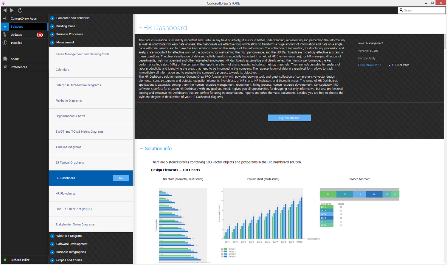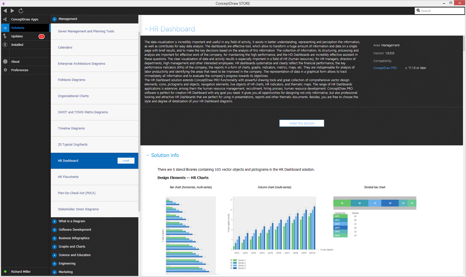 After ConceptDraw DIAGRAM is installed, the HR Dashboard solution can be purchased either from the Management area of ConceptDraw STORE itself or from our online store. Thus, you will be able to use the HR Dashboard solution straight after.