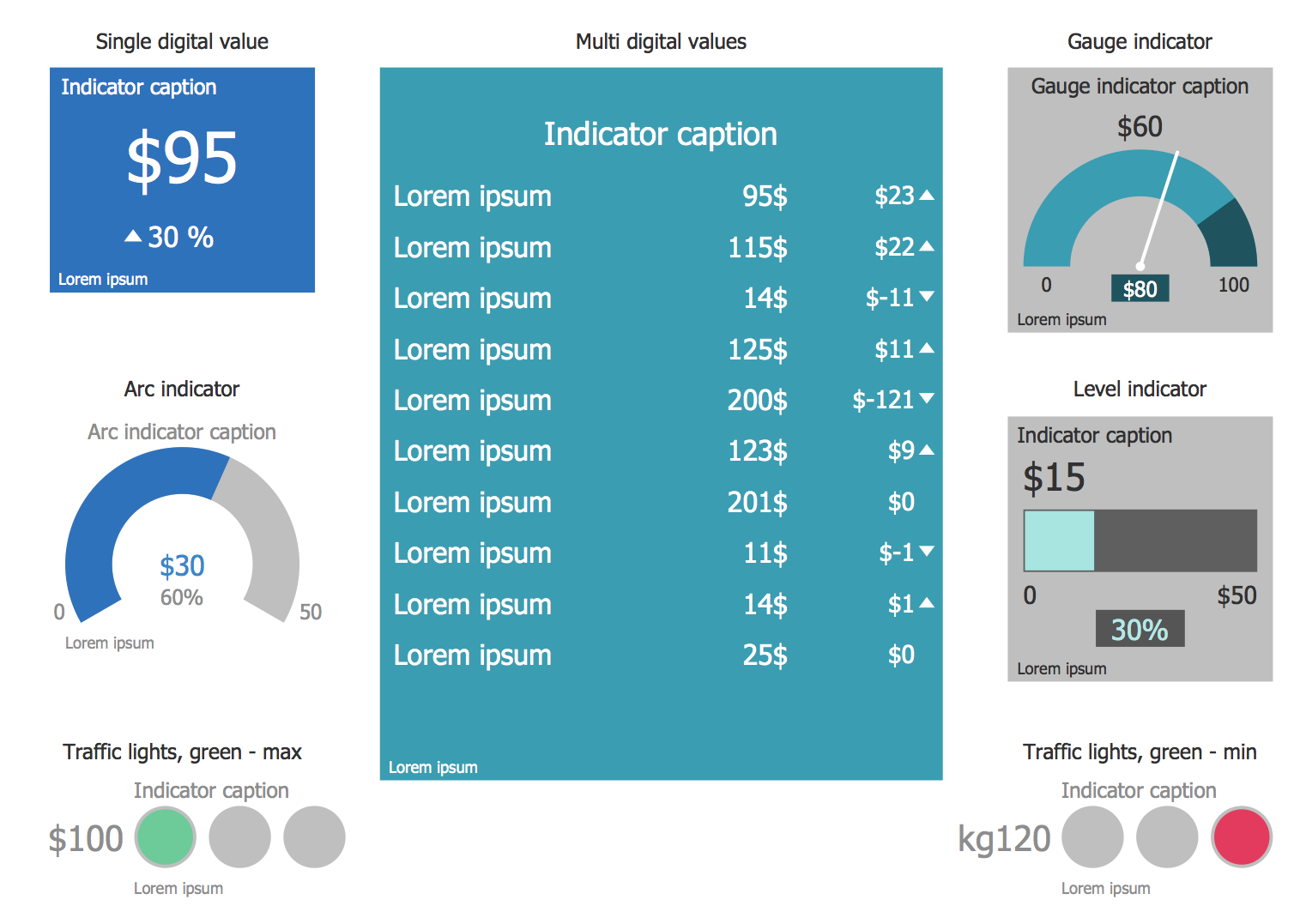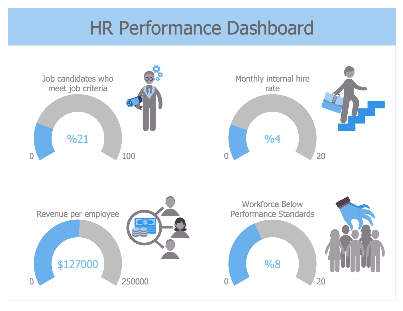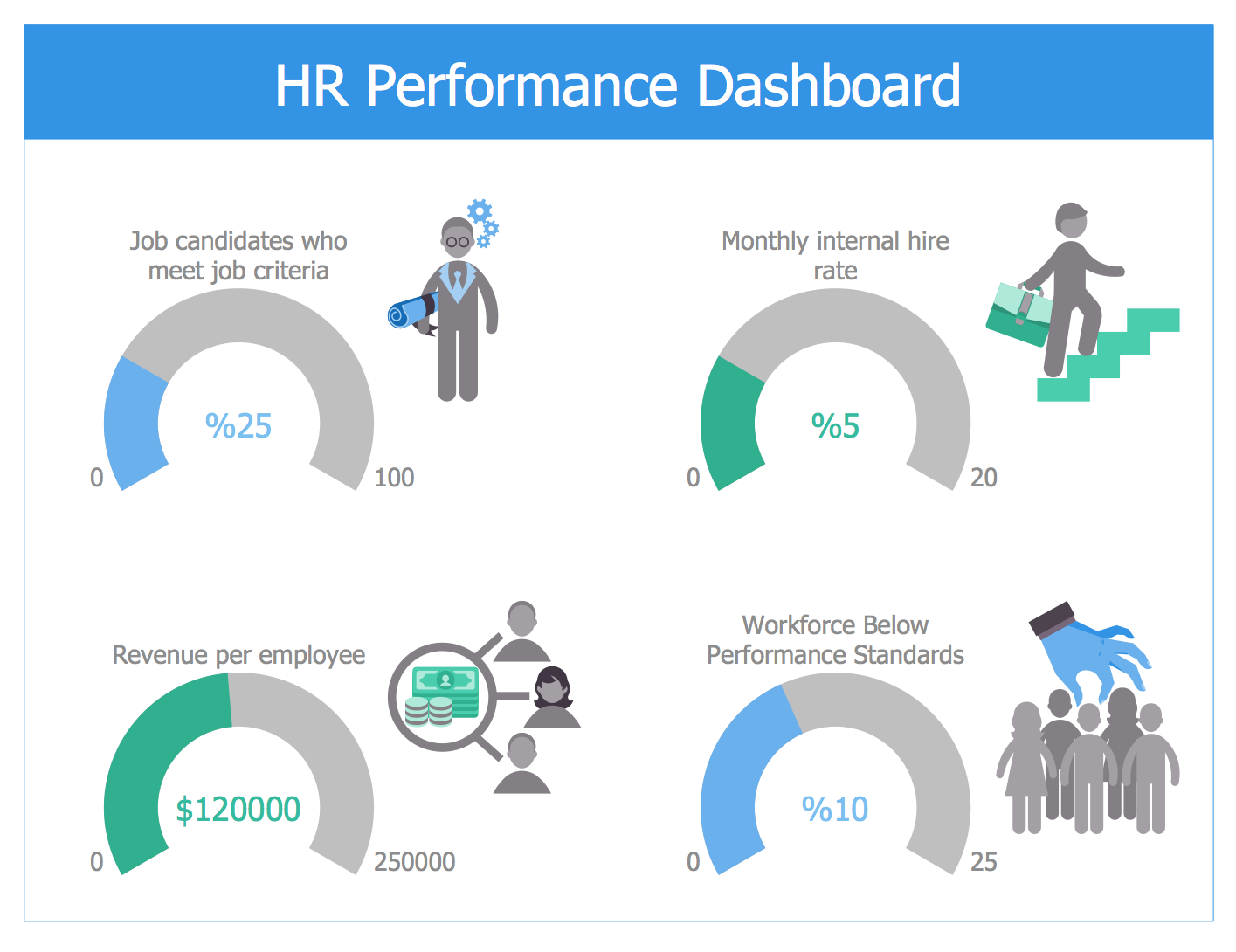 The dashboards are the popular and widely used tools that are often used to represent the key performance indicators (KPIs) in a form easy for observing at a glance. The key performance indicators are incredibly relevant and capacious for wide variety of business processes, business objectives, and many other objectives and spheres of activity, among them the human resources, sales, marketing, production, etc. The human resources (HR) dashboards typically show the numbers associated with the staff recruitment, its composition and retention, thus they can reflect for example the number of free positions, the average cost or quantity of days per recruitment. This HR dashboard sample designed with powerful ConceptDraw DIAGRAM software and its drawing tools is dedicated to performance in HR and depicts the values of four main KPIs, such as the job candidates who meet job criteria, monthly internal hire rate, revenue per employee, and workforce below performance standards.