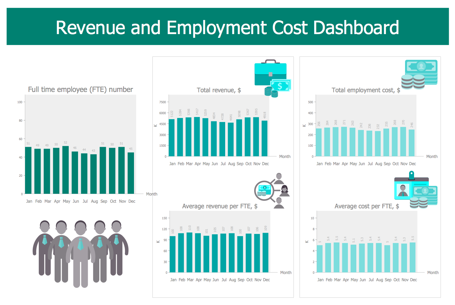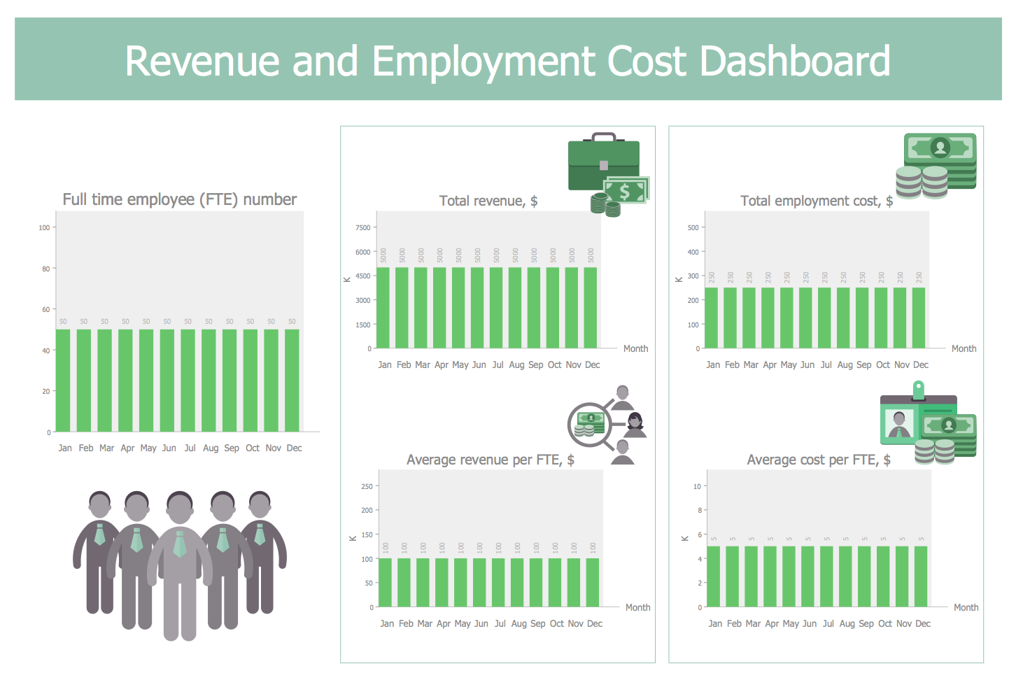 This Revenue and Employment Cost Dashboard template is a kind of HR Dashboards. It is a template designed for ConceptDraw Solution Park and HR Dashboard solution. There are five Column charts represented on it, which display different values and revenue quantities by months: Full time employee (FTE) number, Total revenue, Average revenue per FTE, Total employment cost, Average cost per FTE. At your desire, you can open this template at ConceptDraw DIAGRAM software and set your own values. The Column Charts are ideal way to illustrate the values of different parameters, to compare them in a visual form using the vertical bars of charts, to determine and to depict the changes of data for a particular period of time. Do not forget that visual clipart assist in making the diagrams more informative and illustrative, the libraries of HR Dashboard solution offer great number of ready-to-use clipart to help you design the best looking diagrams.