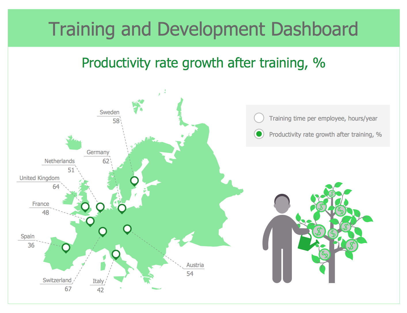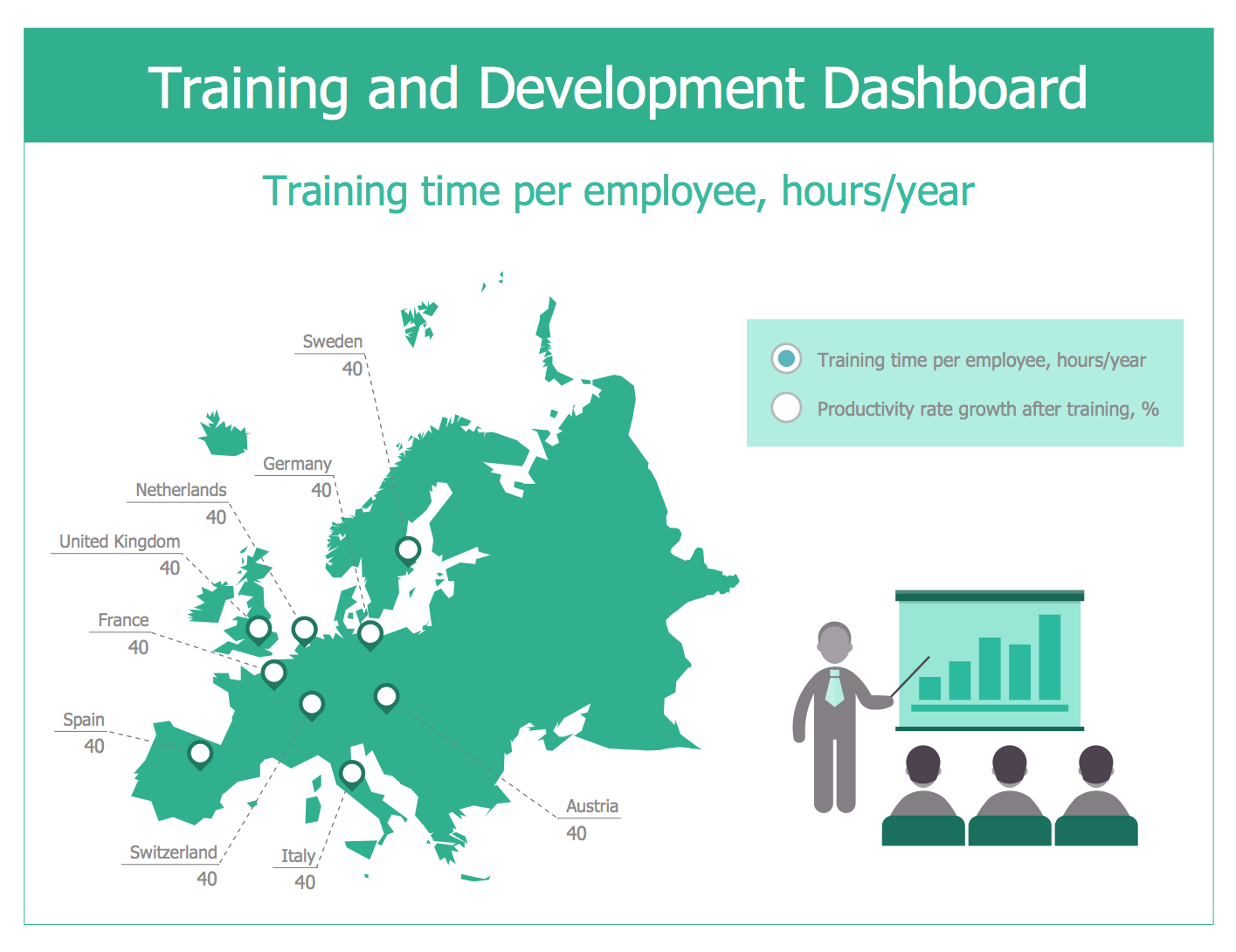 This HR training and development dashboard example designed with ConceptDraw DIAGRAM drawing tools shows two thematic maps with KPIs by European countries: the training time per employee and the productivity rate growth after training. It is easy to switch between two listed pages of this HR diagram. On the first page, you can see the values of training time per employee in hours per year for nine European countries: Sweden, Germany, Netherlands, France, Spain, Switzerland, Italy, Austria, and also United Kingdom. In a second case are represented the values of productivity growth in percents for the same countries. Designed with significant help of ready vector objects of map, human capital and others, it is a good example of simple designing the different HR Dashboards with ConceptDraw DIAGRAM dashboards maker. Save your time with HR Dashboard solution, make the high quality HR Dashboards and use them to design in minutes professional-looking presentations.