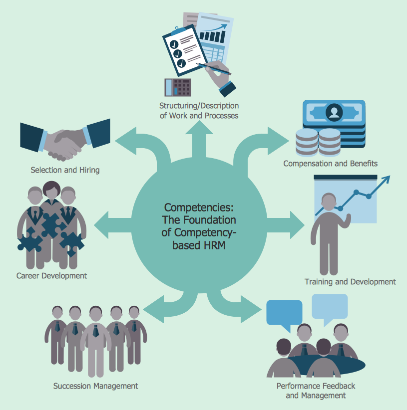 This diagram illustrates the foundation of competency-based human resource management (HRM) and all the processes that come within the HRM circle of competency. It was redesigned from the “Competency-circle.jpg” file published on the Wikimedia Commons. The competencies are specified as knowledge, skills, abilities, behavior, and motivations required for successful job performance. The competency-based human resource planning is a link between the organization’s strategic plan and human resources management. It supports the unification of human resources planning and business planning, and allows you to effectively assess the capacity of the staff based on its personal competence and potential required to achieve the company’s business goals. The human resource strategies, plans, and programs are developed and implemented to close the gaps. As you can see from the diagram, there is a lot of work included in a competency-based HRM, but the ConceptDraw DIAGRAM can simplify the process through the HR Flowcharts solution.
