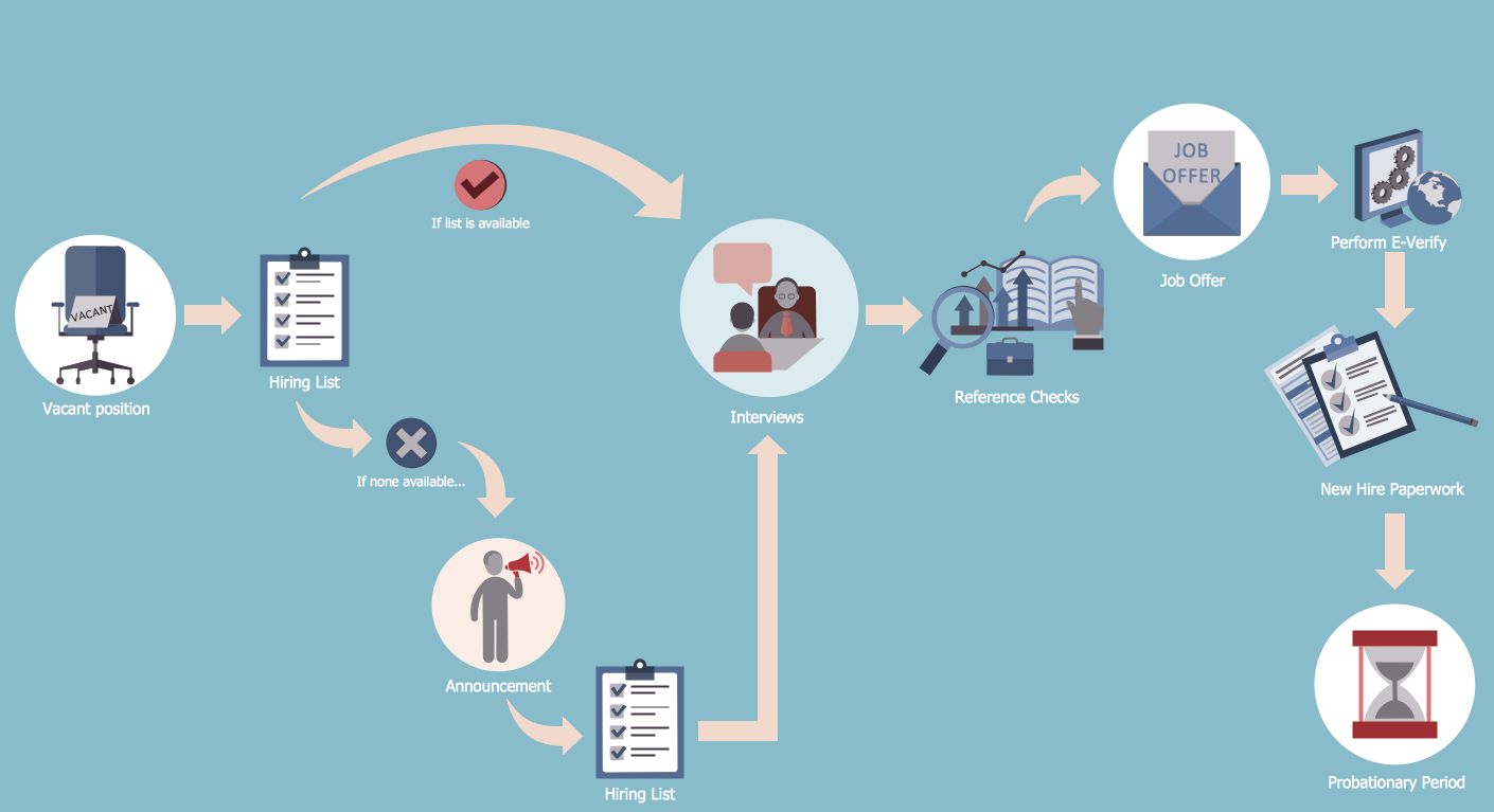This HR infographics example illustrates the hiring process of candidates to the vacant position. It was constructed in ConceptDraw DIAGRAM based on the "Hiring Process" flowchart from the Idaho Division of Human Resources website. This sample is a flowchart outlining the steps needed to be performed to fill a vacant position at the company. The key points are easily noticeable from the diagram, these are the hiring list containing the names of applicants who passed the examination for a vacant position, announcement of a vacant position, the conducting of lawful employment interview with the candidate to determine his suitability for an available position, checking his references with a goal to choose the best one from the several suitable candidates, then offering a job for the selected candidate, also performing verification in the internet based E-Verify system, filling the hire paperwork by new employee, and finally passing the probationary period of working on the offered position.