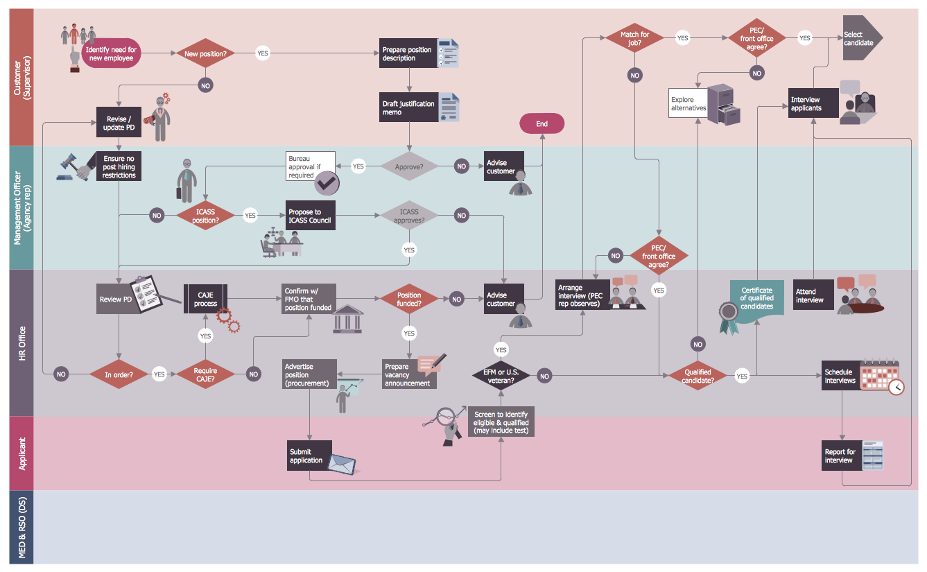 This HR flowchart sample depicts the recruitment process realized by the Post Employment Committee (PEC). It is a cross-functional flowchart that was designed based on the files from the Wikimedia Commons. The Post Employment Committee (PEC) provides the proper application of the US Citizen EFM and US Veterans Hiring Preference. This flowchart includes the set of process steps that are consistently connected by the arrows demonstrating the order of operations. The different shapes have different coloring, even the shapes representing Yes and No variants are colored differently for the great clarity. The flowchart swimlanes also have different backgrounds but in color harmony with each other. You can observe five swimlanes on this diagram: customer (supervisor), management officer (agency rep), HR office, applicant, and MED & RSO (DS). The process steps are placed at the appropriate lanes, at this, you need to avoid a lot of crisscrossing of the flow lines.