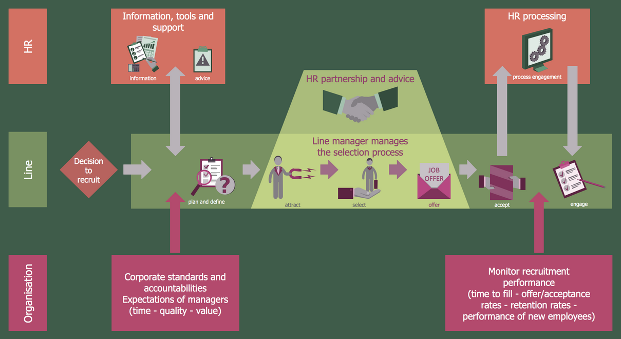 It is known that any HR manager is responsible for identifying work-related needs of staff, using temporary staff or hiring employees to meet such needs, recruiting and training the best employees, monitoring their work, managing relationships with employees, payroll, benefits and compensation, preparing personal policies and employee records, ensuring high efficiency, ensuring equal opportunities for all employees, dealing with discrimination and other performance issues. Ensuring that human resources practices conform to the regulations and pushing the employees' motivation so they achieve more within their organization, HR managers might find the ConceptDraw DIAGRAM software a useful tool for making the needed HR-related drawings.