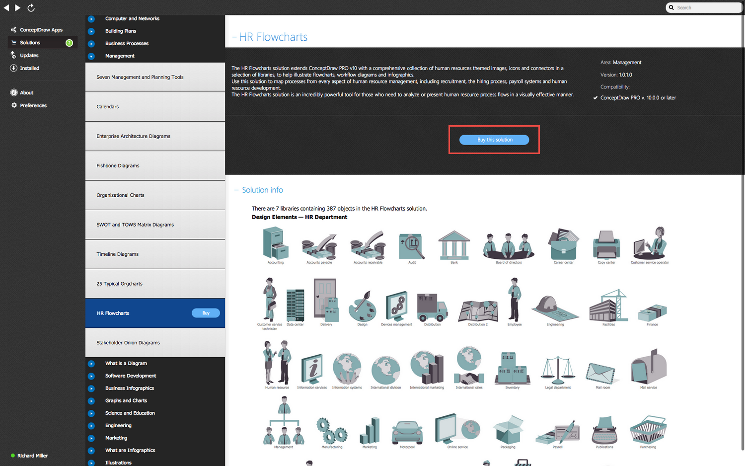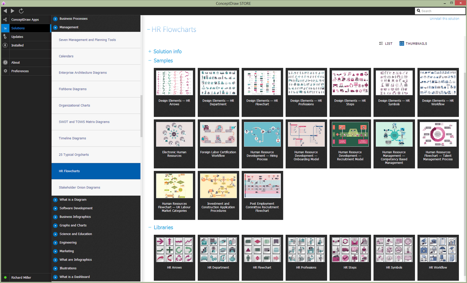 After ConceptDraw DIAGRAM is installed, the HR Flowcharts solution can be purchased either from the Management area of ConceptDraw STORE itself or from our online store. Thus, you will be able to use the HR Flowcharts solution straight after.