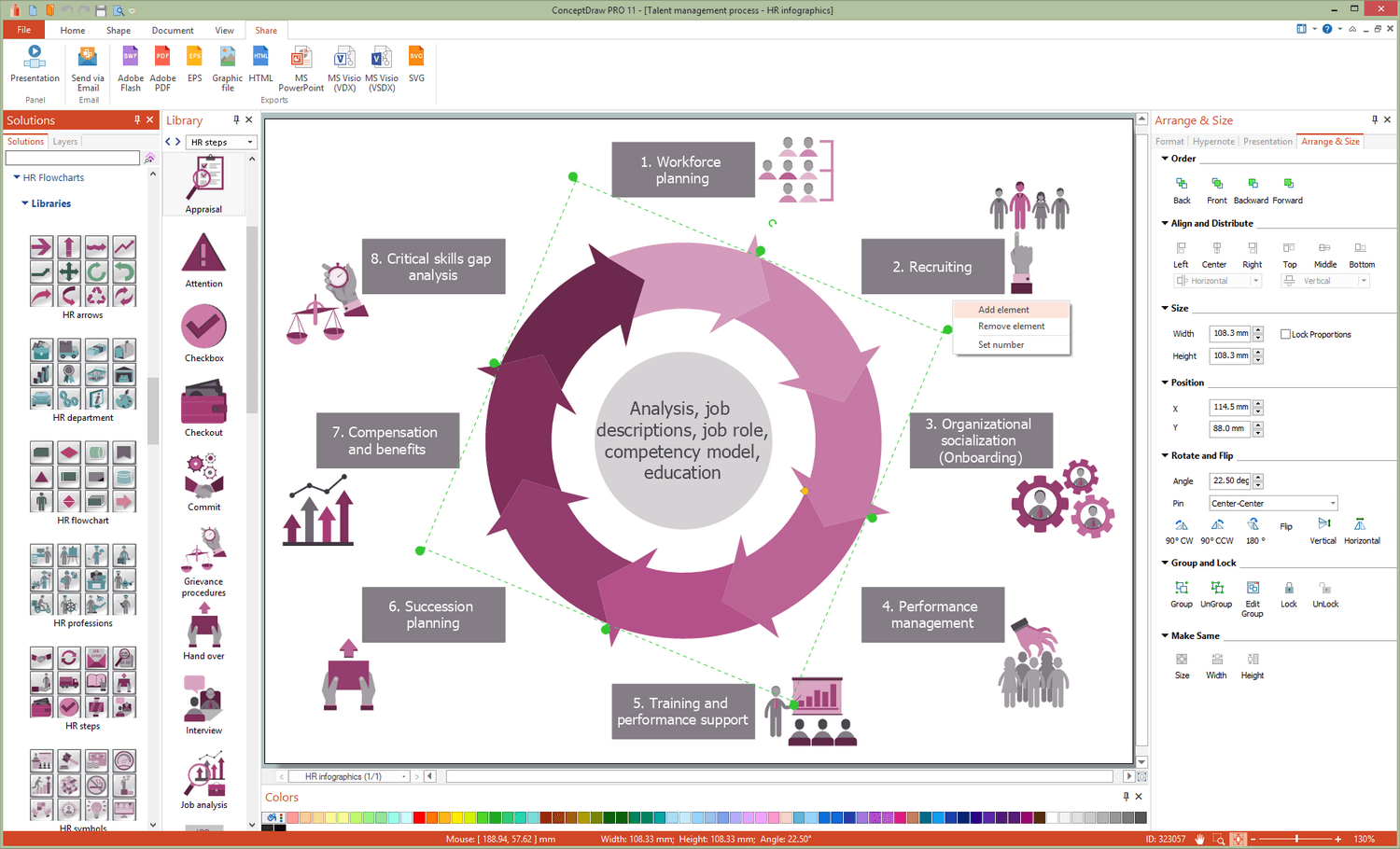 The HR Flowcharts solution contains 10 examples and 7 libraries containing 387 vector graphics and icons.