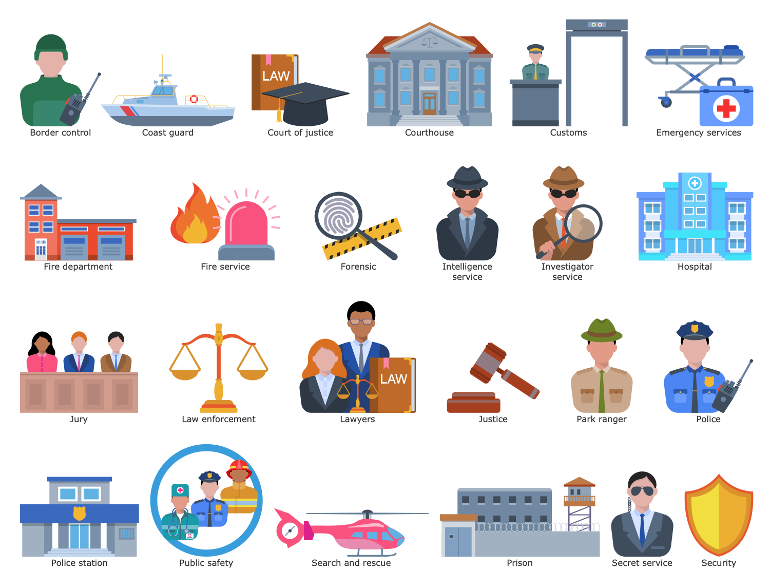 This sample shows 5 sectors of public safety: law enforcement, intelligence and information sharing, emergency, justice, and interior sector. Public safety is the protection and prevention of events that may cause danger to the security and safety of the public, order, health, and well-being of people in a certain territory. It includes the prevention of crimes and property damages, provision of medical emergencies, firefighting, and help in disasters. Public security is an important political and economic issue at both national and international levels. It contributes to economic success, increasing human living standards and productivity, and the attractiveness of a certain location. Public safety organizations are distributed between the sectors and include police (national, federal, regional, state, and local), intelligent services, investigator services, secret services, emergency medical services, fire services, park rangers, search and rescue, courts, forensics, justice ministries, prisons, border and port authorities, coast guard, and customs.