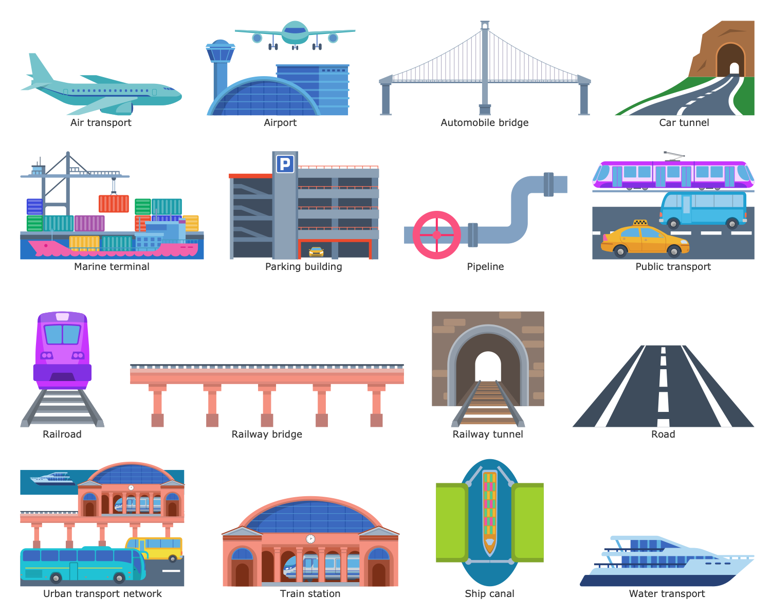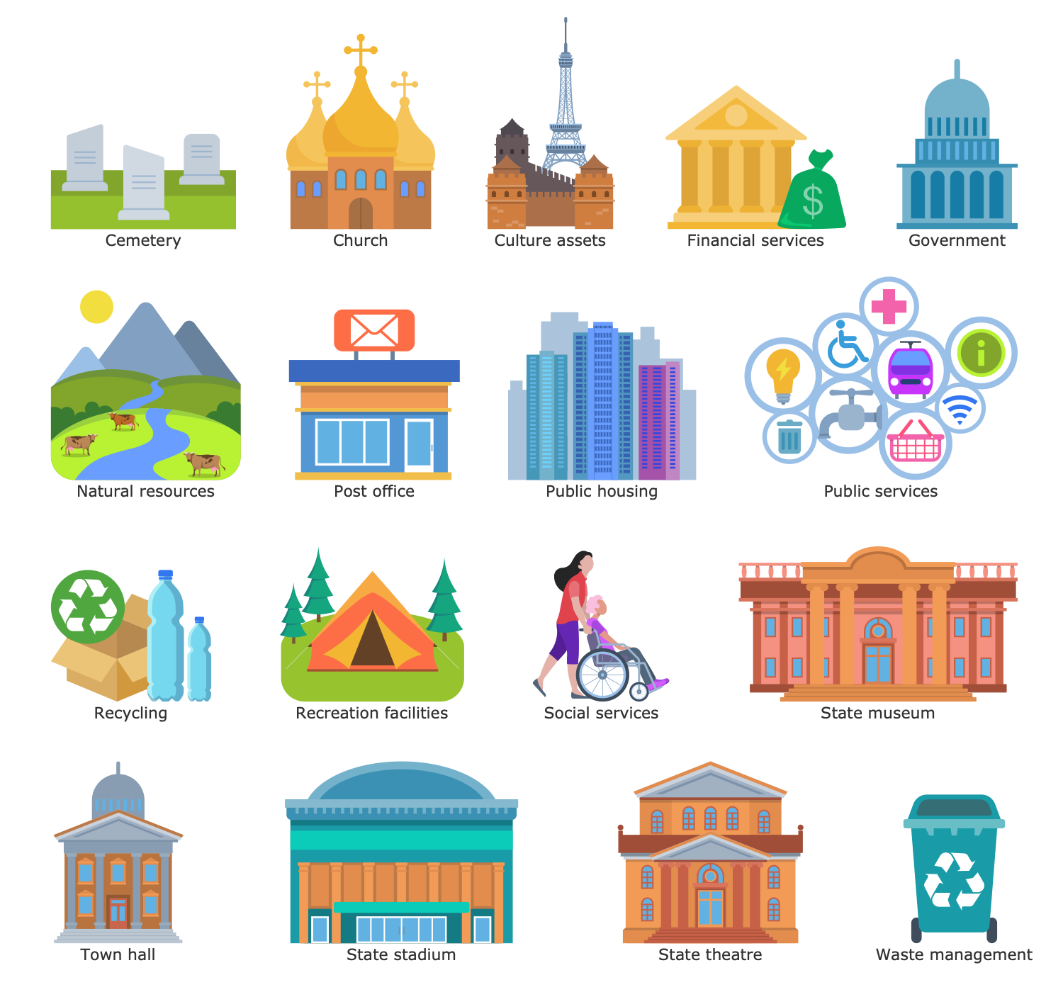 This sample shows a variety of public buildings, which are part of public works and public infrastructure projects ensuring health, safety, recreation, employment, and other aims. Public buildings include hospitals, pharmacies, fire stations, schools and universities, science centers, churches, police stations, prisons, post offices, banks, government and municipal buildings, airport and marine terminals, train stations, libraries, theaters, museums, stadiums, courthouses, power stations, parking buildings, and town halls. They are built wholly or in part by public funds and are important for the entire society. Public buildings provide public services, connect people, and are accessible to the public for assembly, education, treatment, entertainment, economic activity, support community, and other goals. Public buildings reflect the priorities of the people and governments, culture, and era when they were built, and should be structurally sound and reliable. Many of the public buildings built in previous centuries are architecturally significant and create a great impression nowadays. The public utility icons included in the libraries of the Public Utilities solutions serve for easy designing your diagrams.