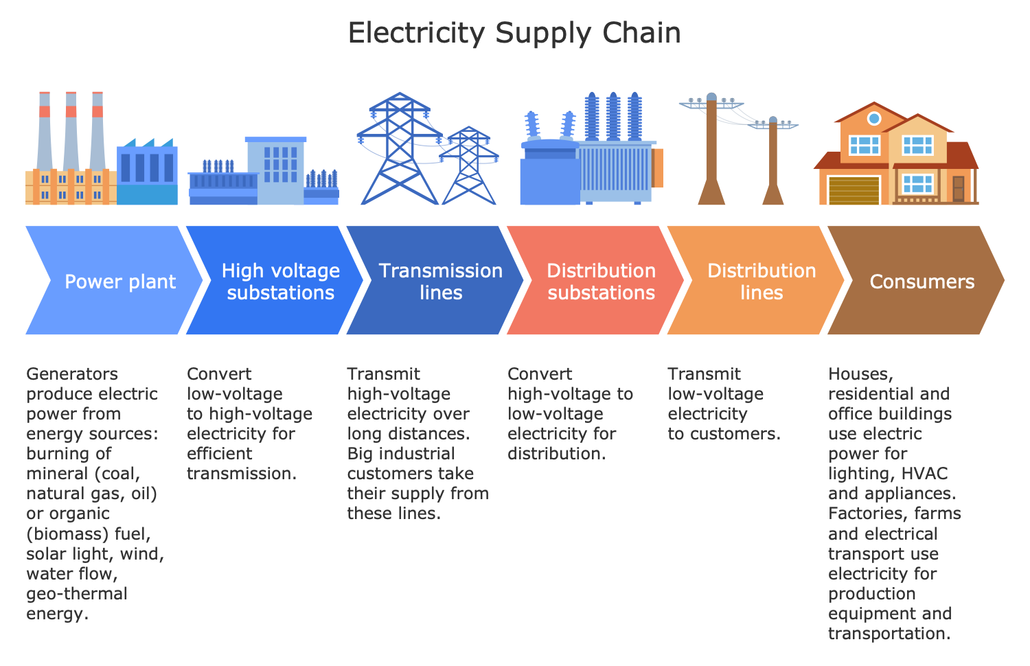 This electrical diagram sample shows the electricity supply chain from the power plants to the end consumers through high-voltage substations, transmission lines, distribution substations, and distribution lines. All components of the electrical grid are interconnected to each other. The generators at the power plants produce electric power from mineral and organic energy sources including coal, natural gas, oil, and biomass, and renewable energy sources like solar light, water flow, wind, and geothermal energy. High-voltage substations are responsible for converting low-voltage electricity to high-voltage for efficient transmission. Transmission lines allow high-voltage electricity transmission over long distances. Distribution substations convert high-voltage electricity to low-voltage for mass distribution to consumers (residential and office buildings, private homes) through distribution lines. High-voltage electricity is directly supplied only to large industrial enterprises.