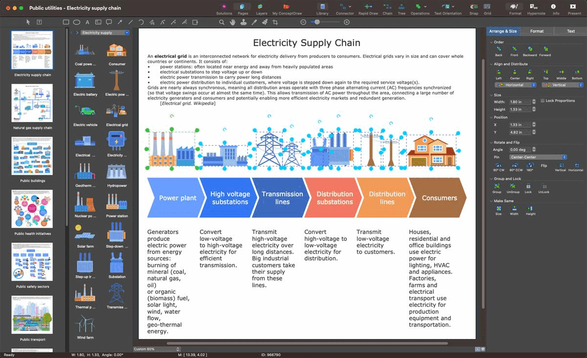 This sample shows the supply chain of natural gas, which is a fossil fuel and non-renewable resource, naturally occurring underground over millions of years as a result of the decomposition of organic matter under anaerobic conditions, intense heat, and pressure through biogenic or thermogenic processes. Natural gas is a mixture of gaseous hydrocarbons, mainly methane and low levels of higher alkanes and trace gases. It is used in household and manufacturing, it is burned for heating, cooking, electricity generation, etc. Methane is colorless and odorless, therefore for safety reasons unpleasant odorizers like mercaptan are added and help to detect leaks. The extraction and consumption of natural gas from underground geological formations on land and drilling underwater have great scopes. From the gas processing and treatment plant, it is transmitted through transmission lines to gas storage facility and electric power generation stations, industrial factories, and then is distributed to residential and commercial customers, including power stations for vehicles. Design easily supply chain, plumbing plan, and heating plan in ConceptDraw DIAGRAM with the Public Utilities solution.