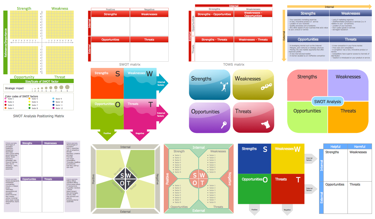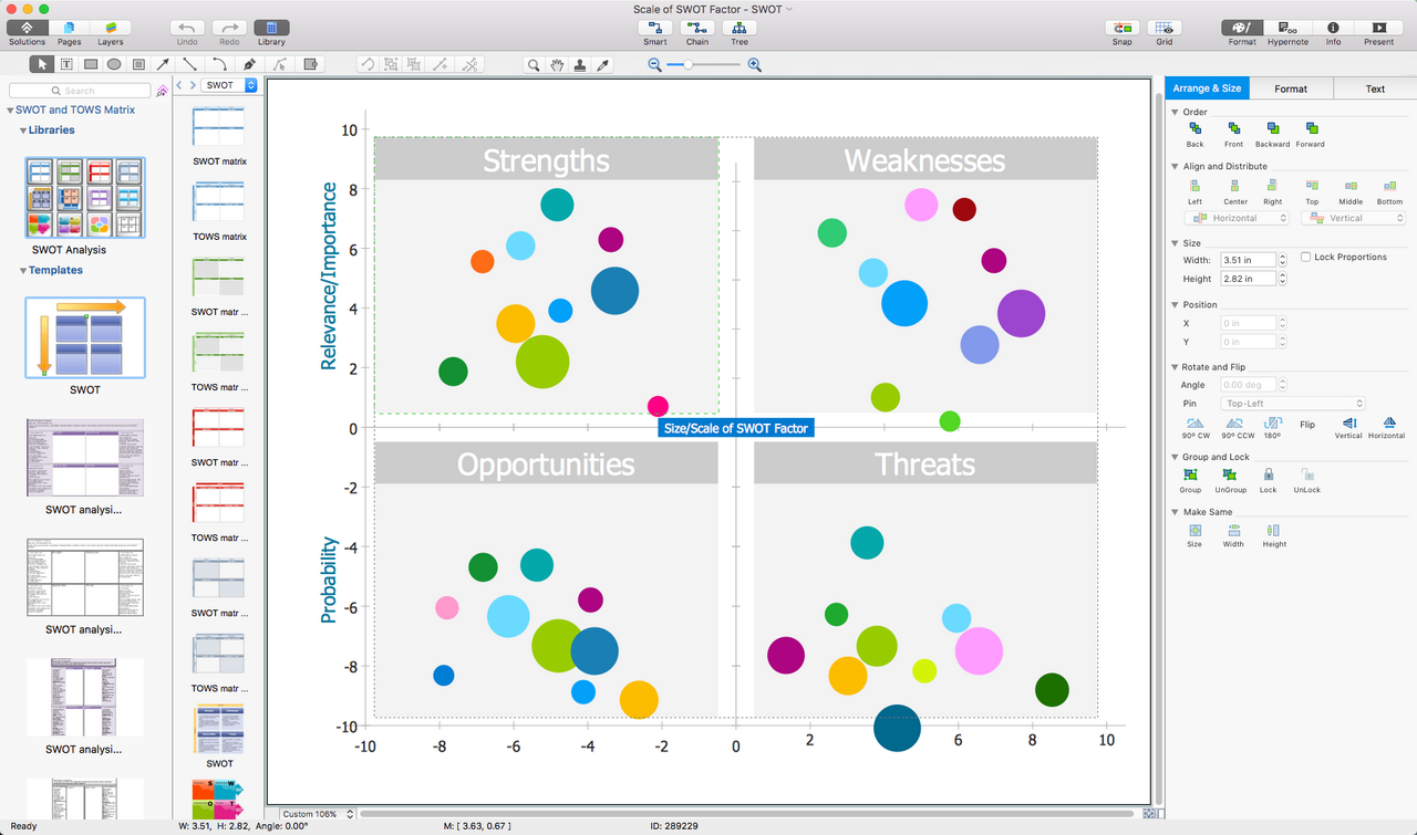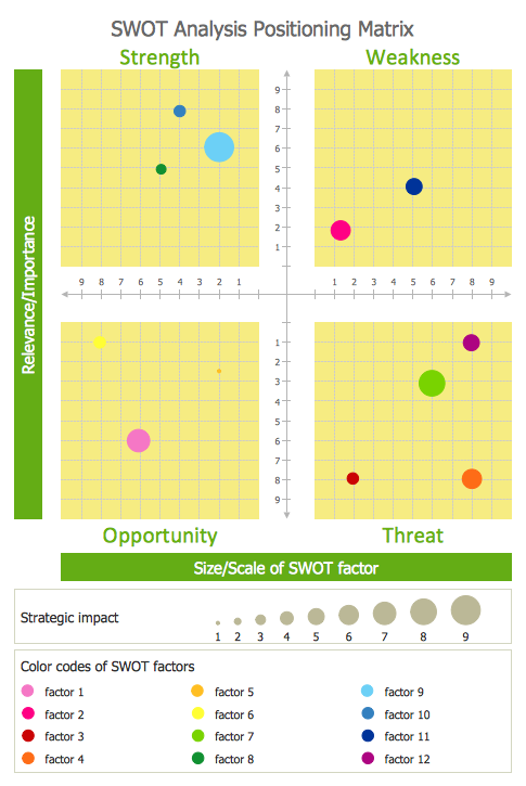This SWOT analysis matrix template helps you in positioning of SWOT factors as bubbles on bubble chart by size/scale (X axis) and relevance/importance (Y axis). The diameter of bubbles shows strategic impact of SWOT factors.