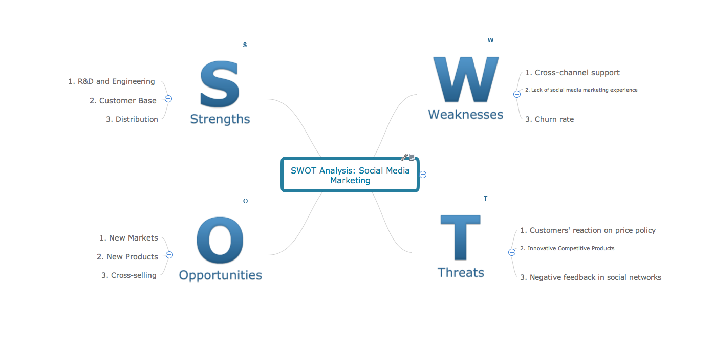 There are a few samples that you see on this page which were created in the ConceptDraw DIAGRAM and ConceptDraw MINDMAP applications by using the SWOT Analysis solution. Some of the solution's capabilities as well as the professional results which you can achieve are all demonstrated here on this page.