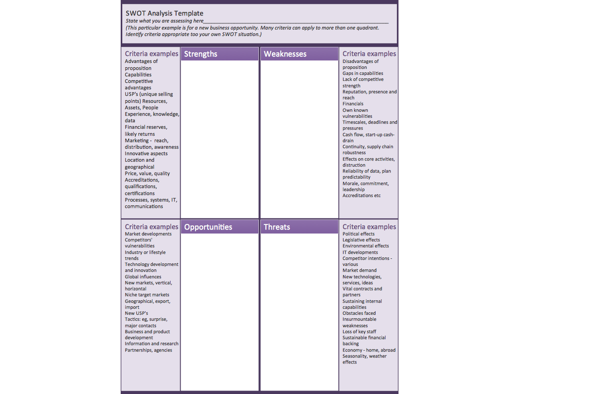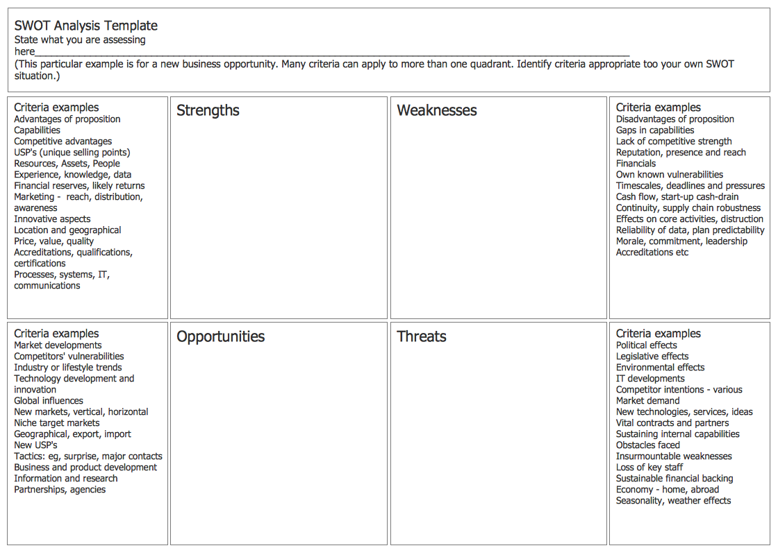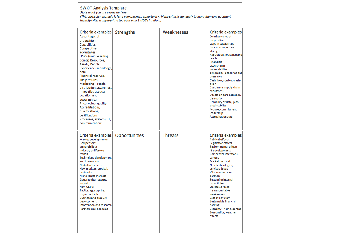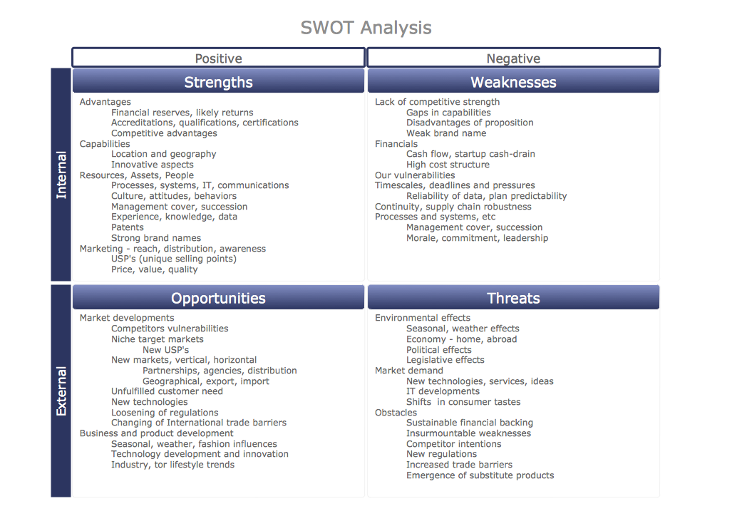 This sample has been produced by adding data to the SWOT Matrix template in ConceptDraw DIAGRAM, which is available for reviewing, modifying or converting to a variety of formats (PDF file, Power point Presentation, image or MS Visio XML) from the ConceptDraw STORE, for all users who have installed SWOT and TOWS Matrix Diagrams Solution.