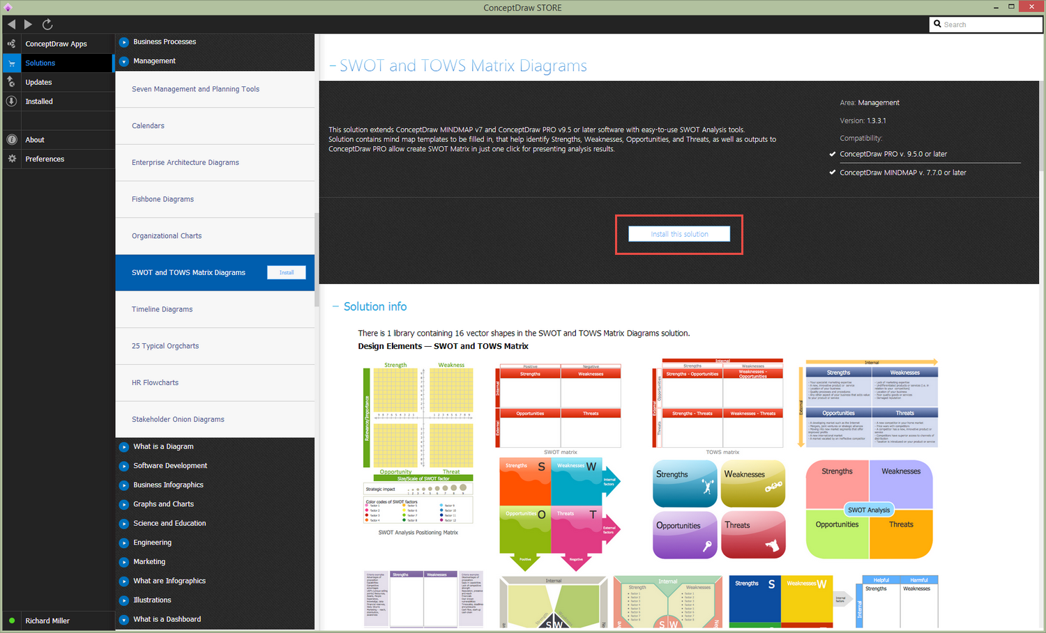 After ConceptDraw STORE and ConceptDraw DIAGRAM are downloaded and installed, you can install the SWOT and TOWS Matrix Diagrams solution from the ConceptDraw STORE.