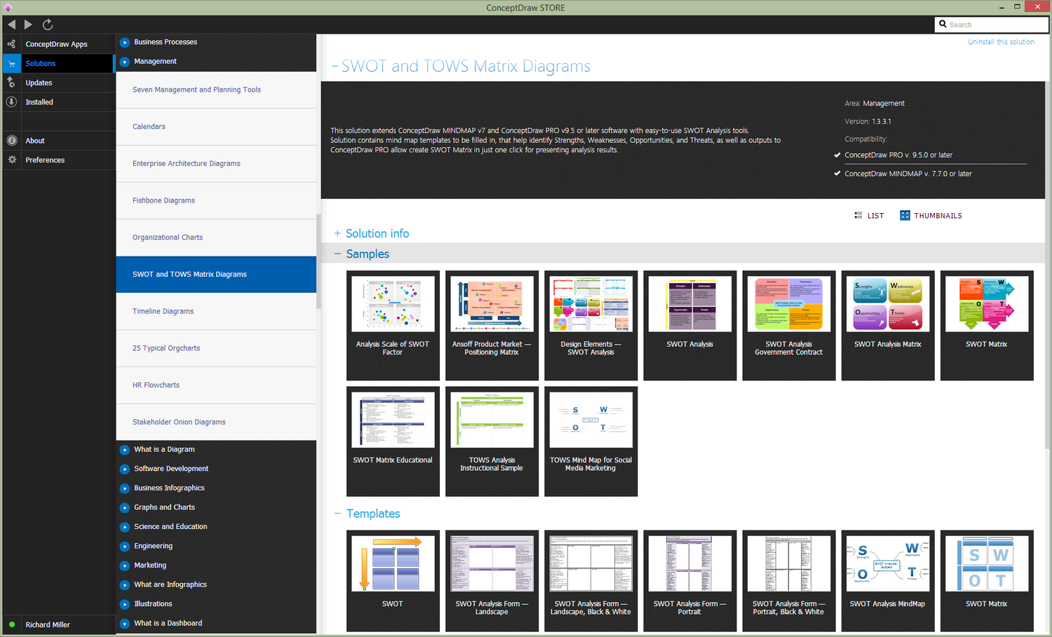 Both ConceptDraw DIAGRAM diagramming and drawing software and the SWOT and TOWS Matrix Diagrams solution can help creating the business planning diagrams you need. The SWOT and TOWS Matrix Diagrams solution can be found in the Management area of ConceptDraw STORE application that can be downloaded from this site. Make sure that both ConceptDraw DIAGRAM and ConceptDraw STORE applications are installed on your computer before you get started.