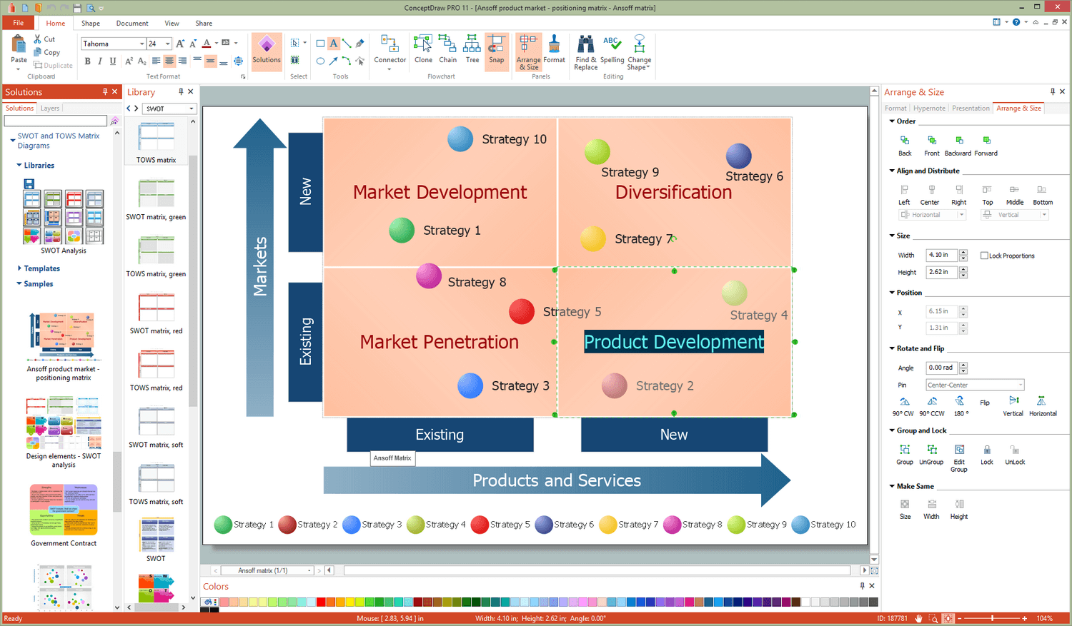 All source documents are vector graphic documents which are always available for modifying, reviewing and/or converting to many different formats, such as MS PowerPoint, PDF file, MS Visio, and many other graphic ones from the ConceptDraw Solution Park or ConceptDraw STORE. The SWOT Analysis solution is available to all ConceptDraw DIAGRAM users to get installed and used while working in the ConceptDraw DIAGRAM diagramming and drawing software.