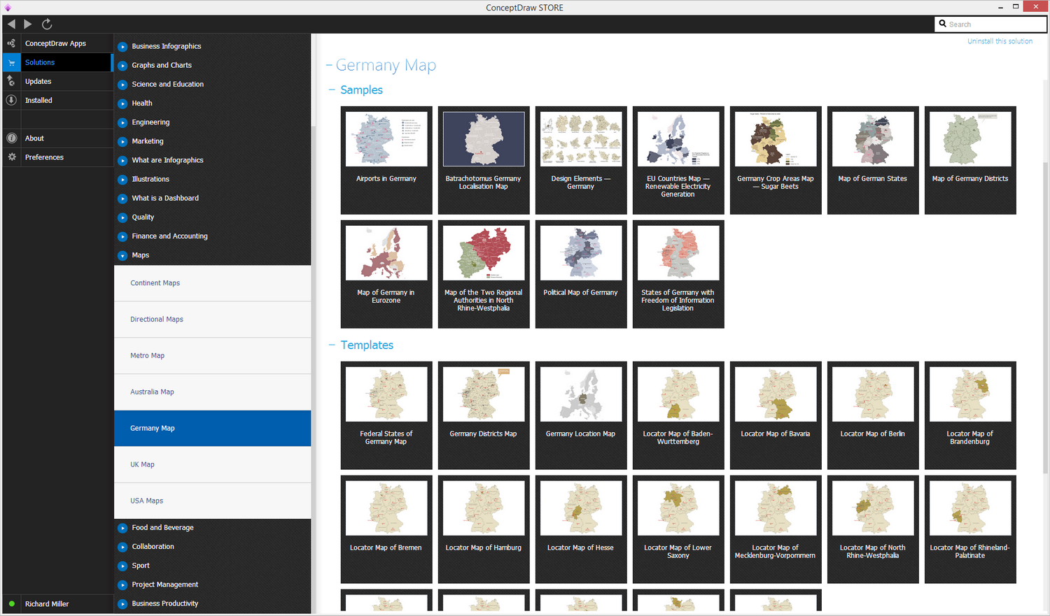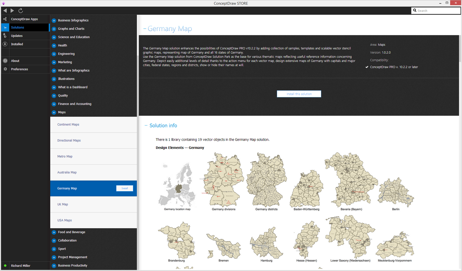 After ConceptDraw STORE and ConceptDraw DIAGRAM are downloaded and installed, you can install the Germany Map solution from the ConceptDraw STORE.