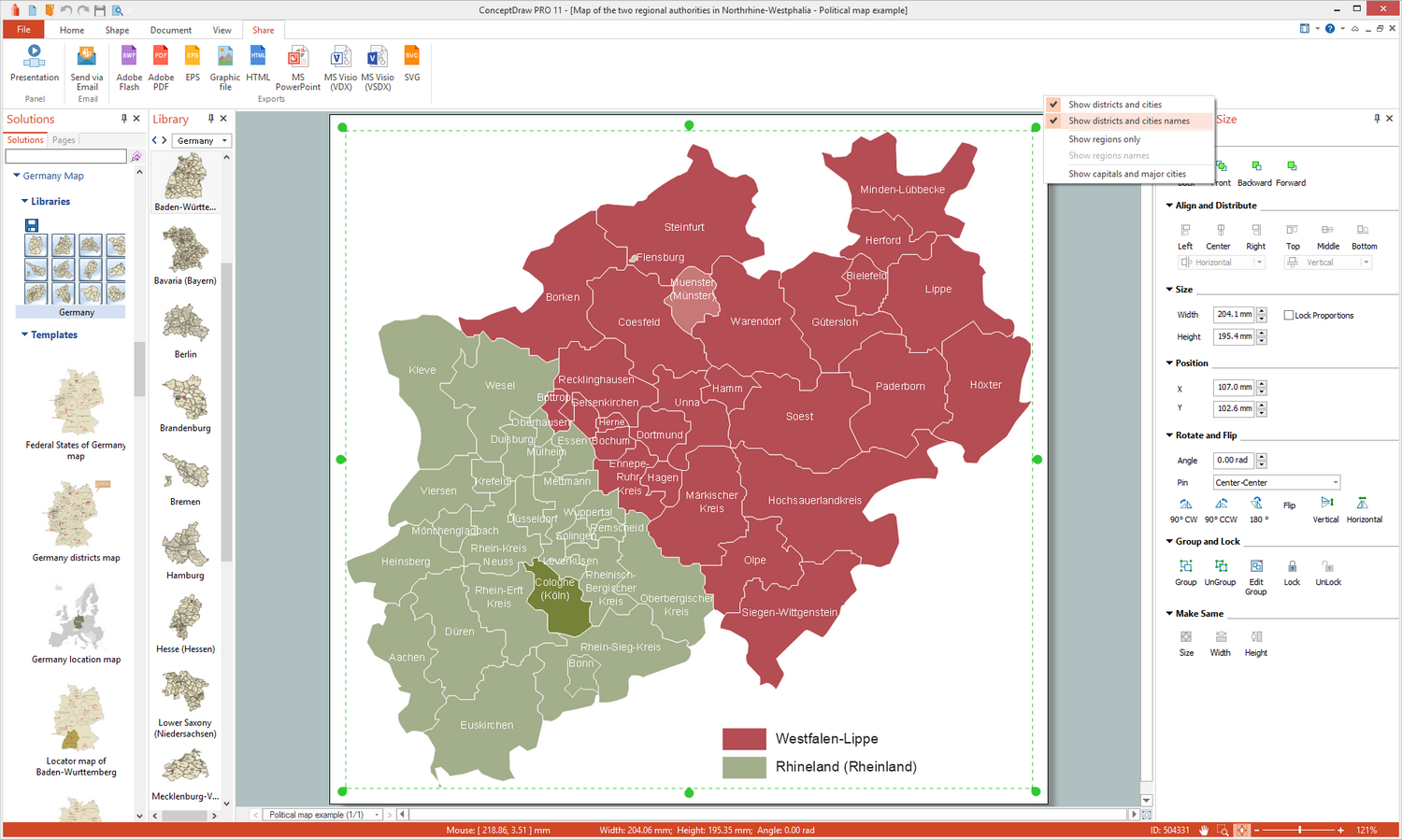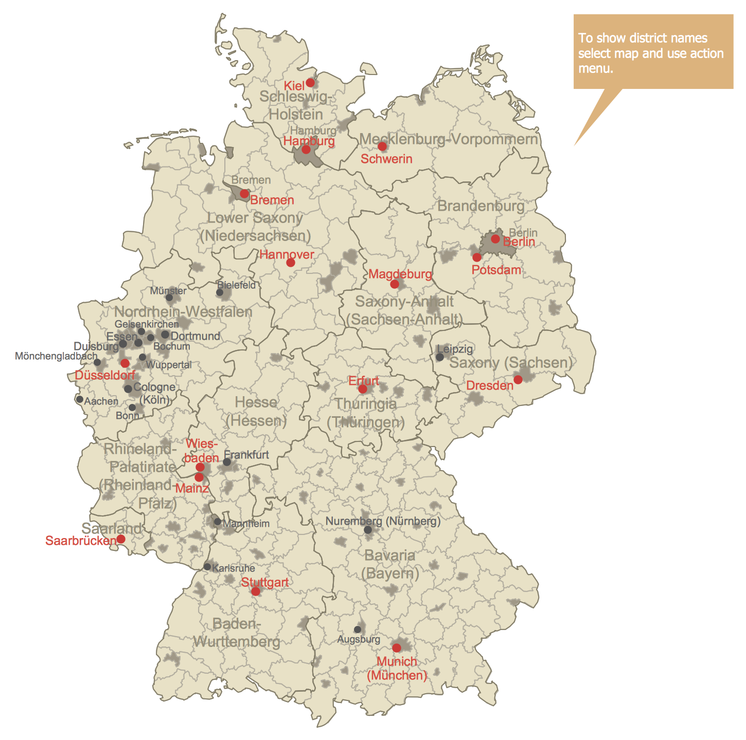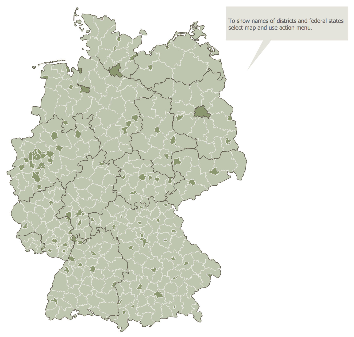 There are a few samples that you see on this page which were created in the ConceptDraw DIAGRAM application by using the Germany Map solution. Some of the solution's capabilities as well as the professional results which you can achieve are all demonstrated here on this page.
