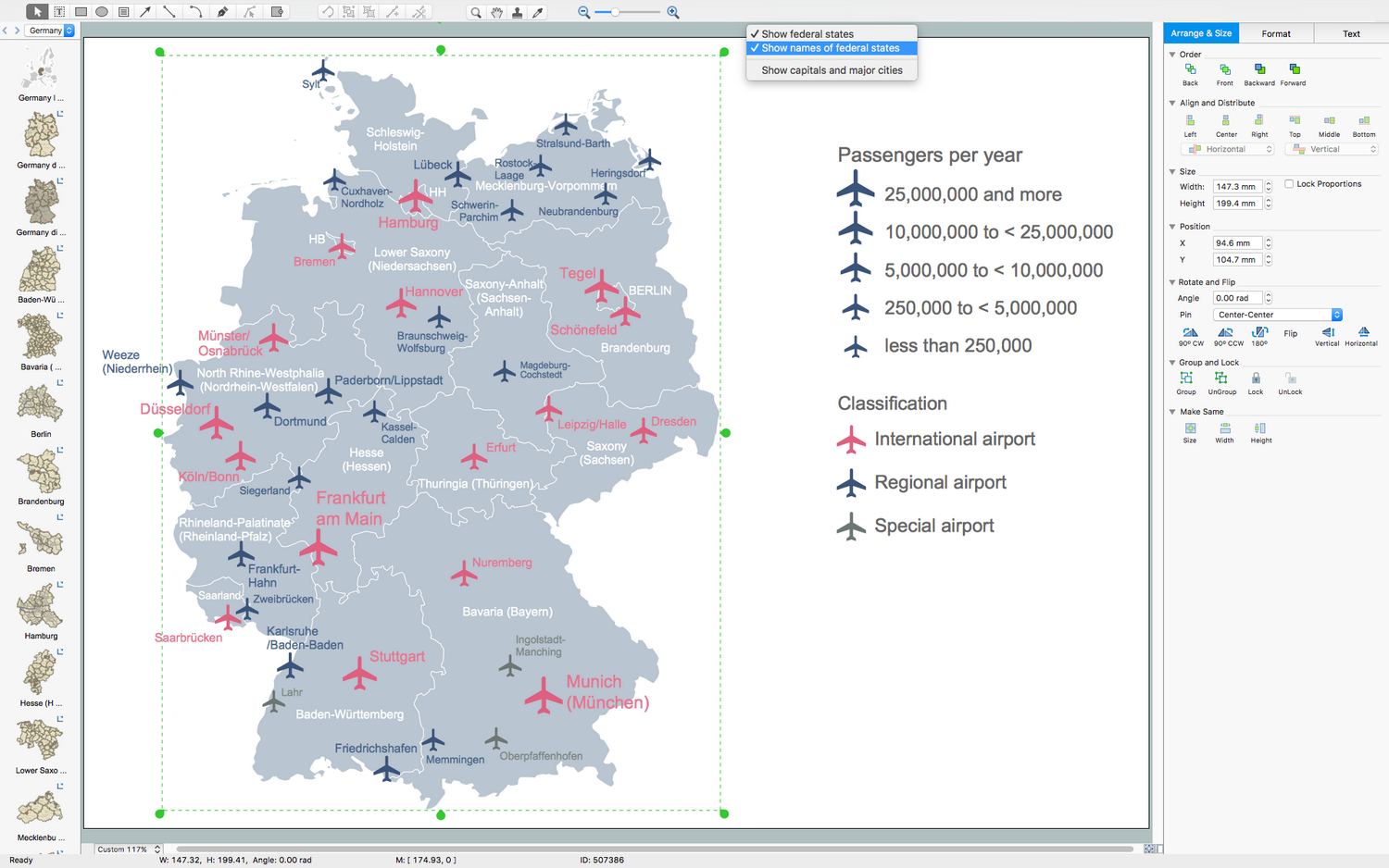 Using the diagramming software ConceptDraw DIAGRAM, in conjunction with the Germany Maps solution, gives users a powerful set of tools that allows them to quickly and intuitively create thematic maps based on Germany's national and district borders. The solution contains a professionally drawn map of Germany, with the ability to toggle the display of state borders and major cities, allowing further layers of detail to be added. As is common with ConceptDraw solutions, a number of templates and samples are provided to spark creativity and give map and infographic designers a solid base to start working from.