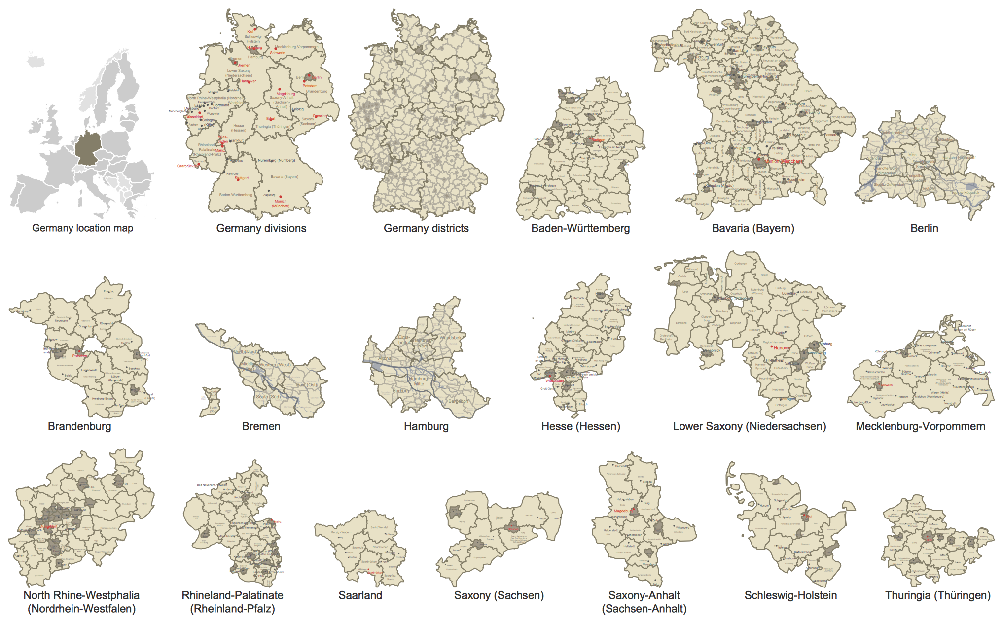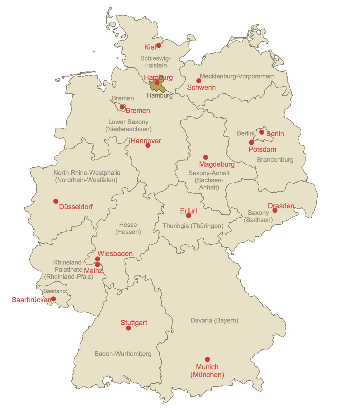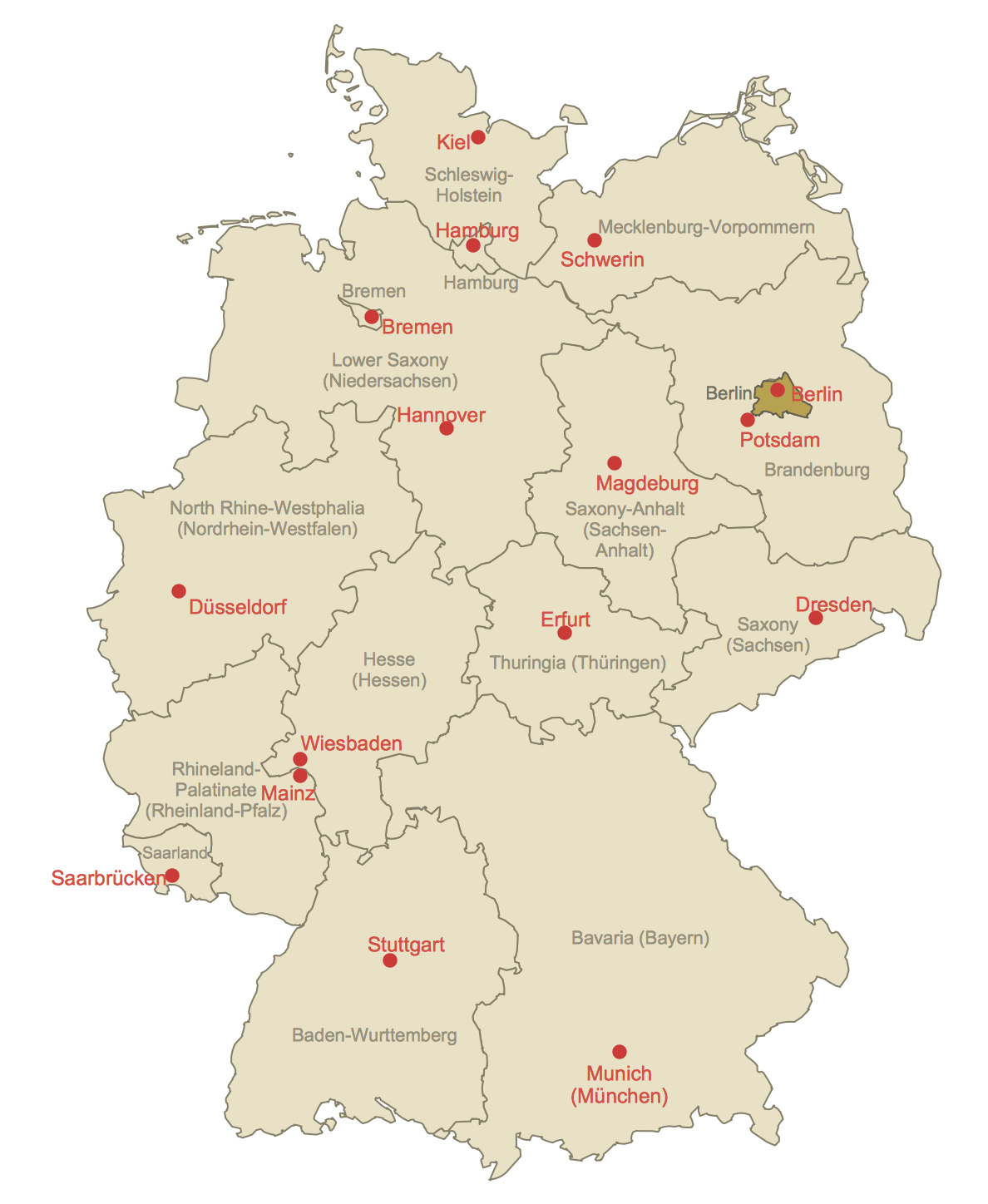 ConceptDraw DIAGRAM diagramming and drawing software makes it possible to create any needed map of Germany from a scratch but using the Germany Map solution may enable any ConceptDraw DIAGRAM user to design it quicker by providing the collection of the pre-made examples and templates of the maps as well as the vector stencil graphic maps of Germany, including all its 16 states.
