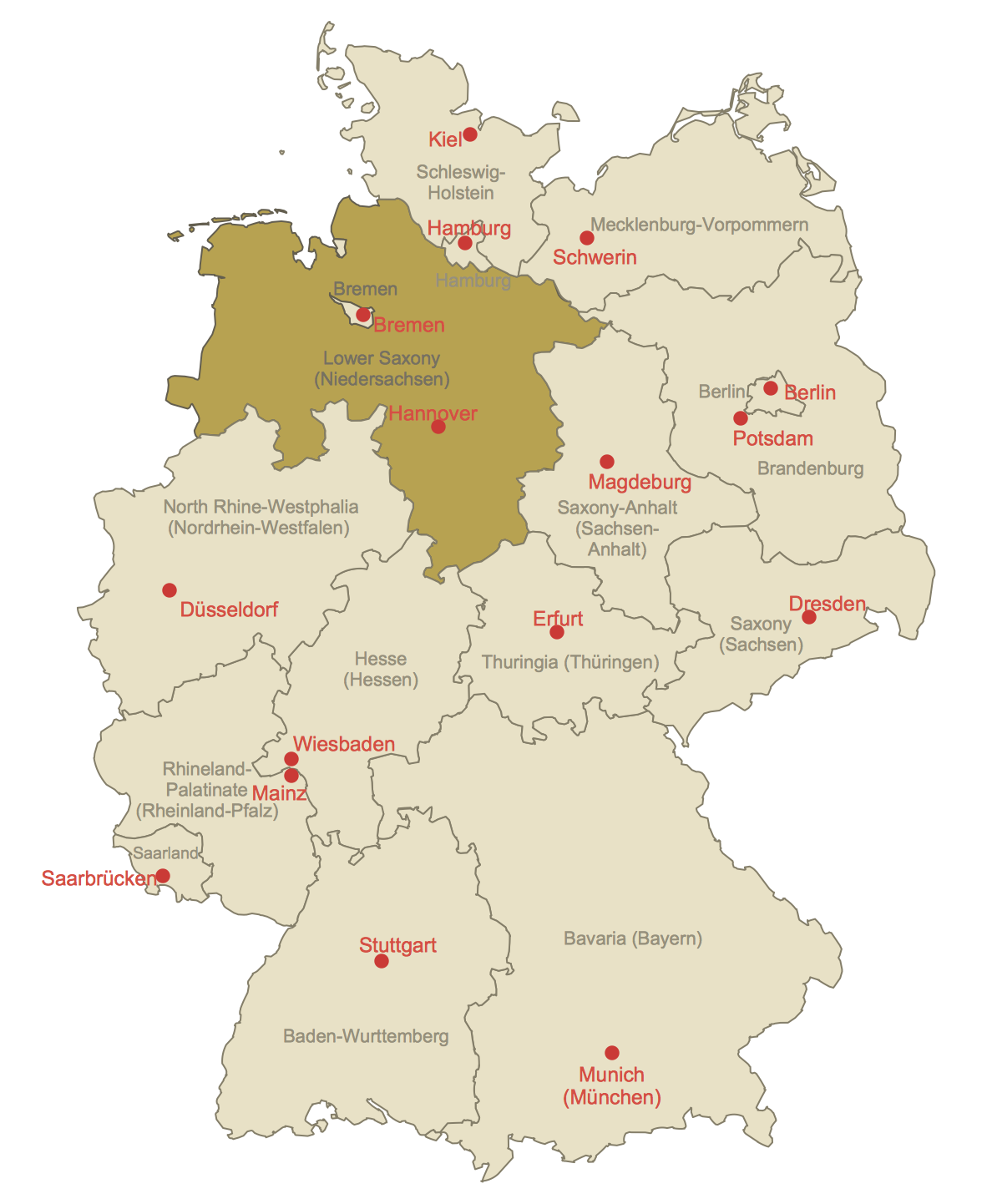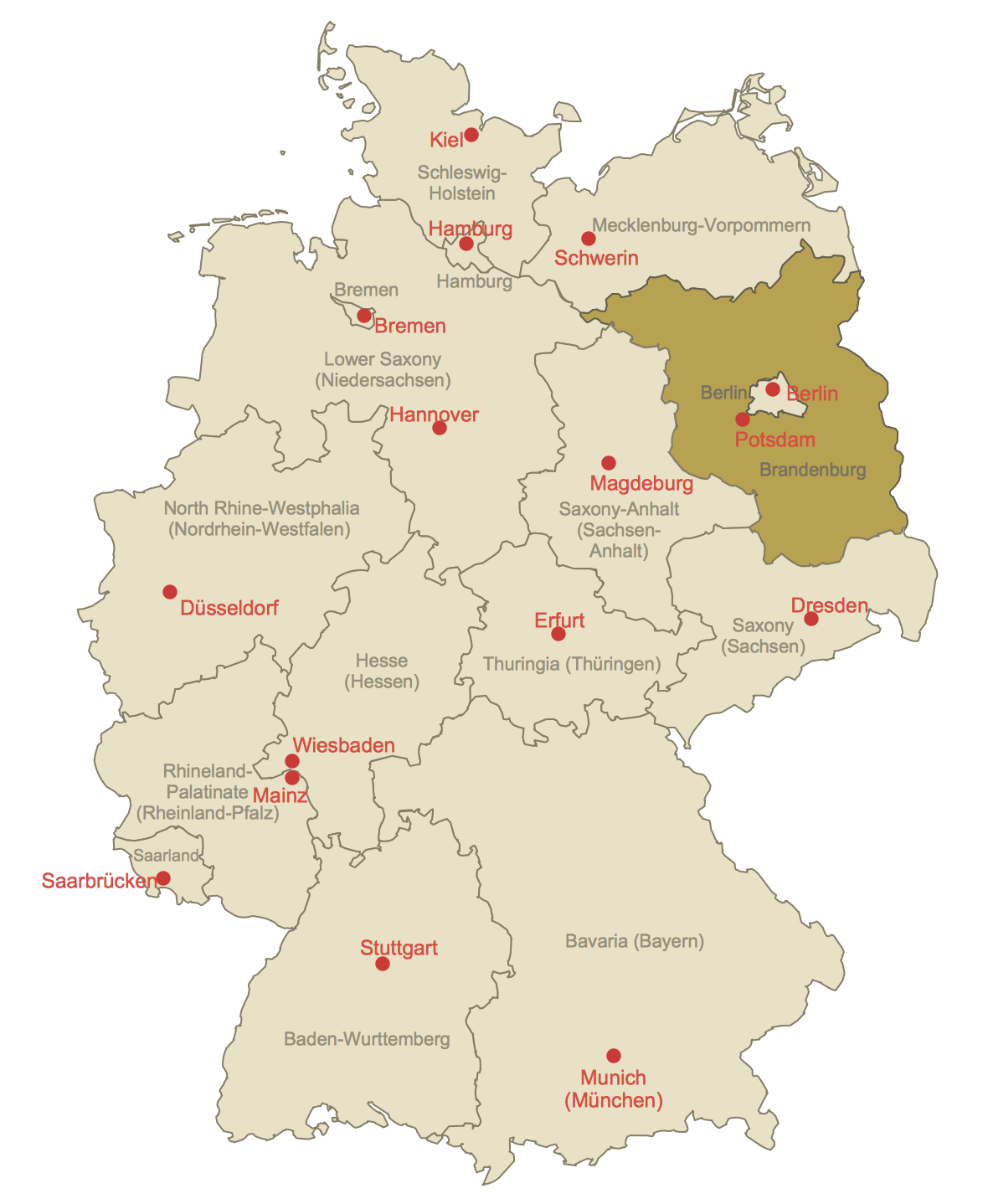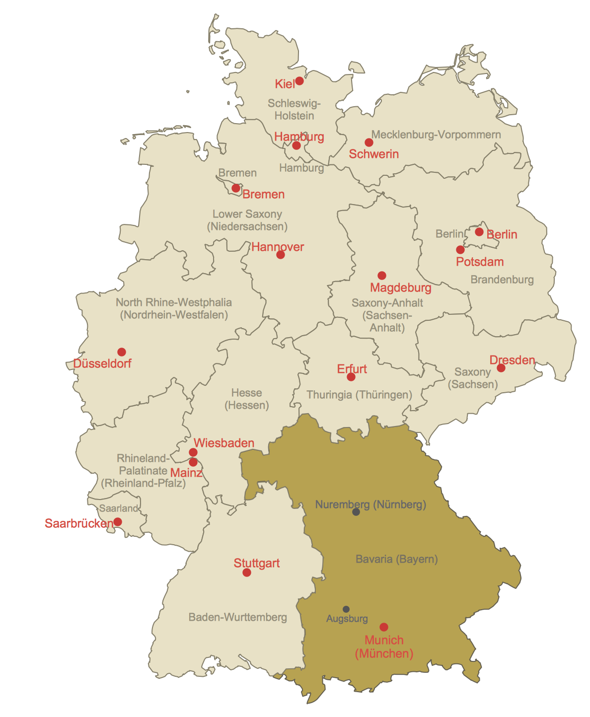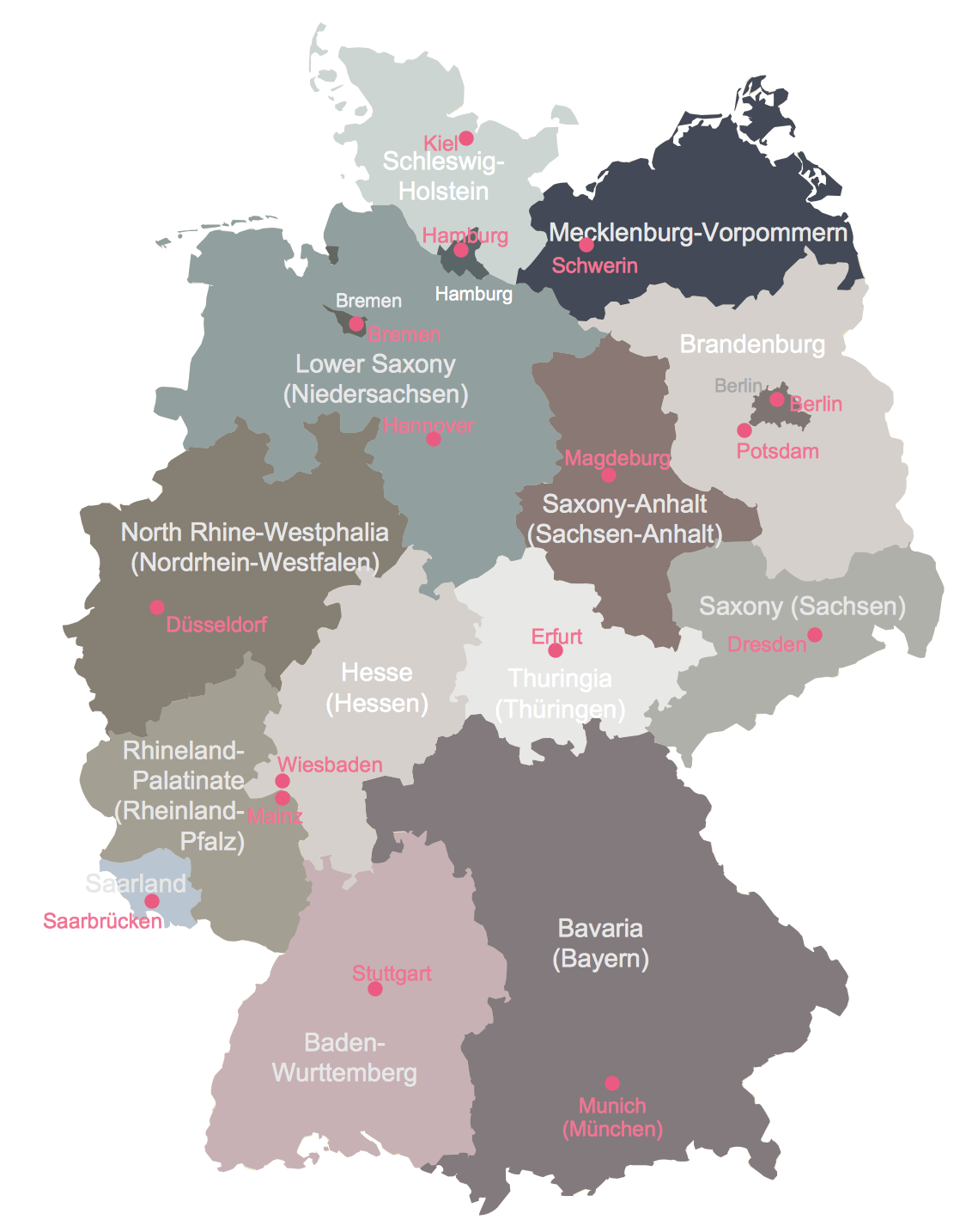 ConceptDraw DIAGRAM diagramming and drawing software makes it possible to create any needed map of Germany from a scratch but using the Germany Map solution may enable any ConceptDraw DIAGRAM user to design it quicker by providing the collection of the pre-made examples and templates of the maps as well as the vector stencil graphic maps of Germany, including all its 16 states.