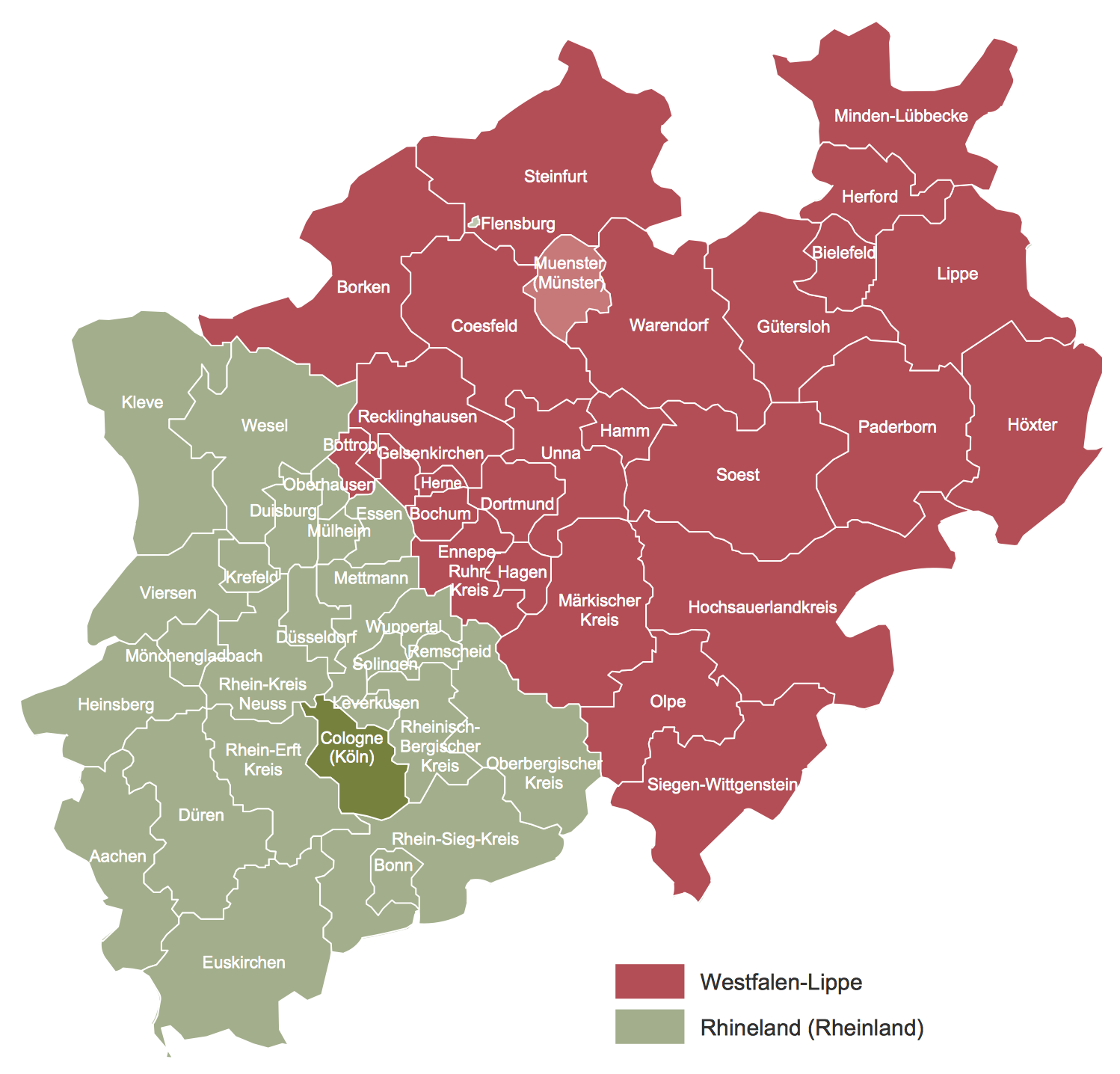 This catchy map demonstrates the regional authorities Rhineland (green) and Westphalia-Lippe (red) in North Rhine-Westphalia, which is the most populous state of Germany. It was created in minutes on the base of ready map of North Rhine-Westphalia offered by Germany Map solution for ConceptDraw DIAGRAM